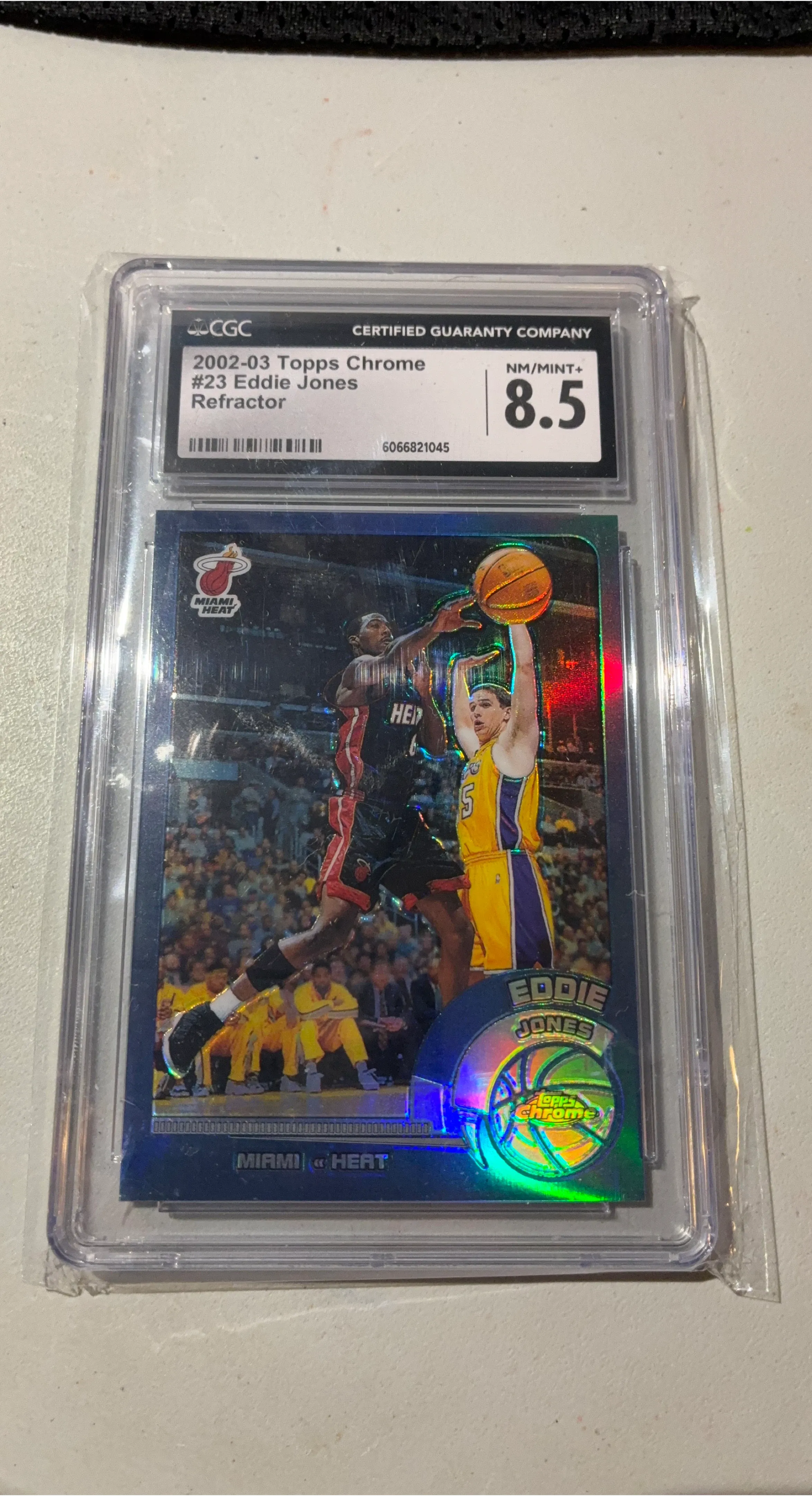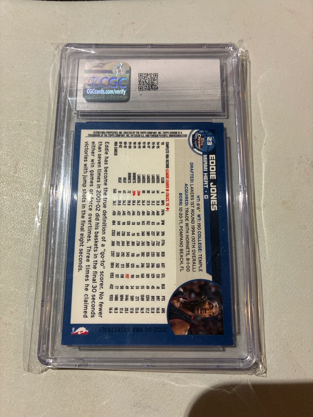 This is a 2002-03 Topps Chrome Refractor basketball card featuring Eddie Jones, graded NM/MINT+ 8.5 by CGC. The card is #23 and was released by Topps Chrome. It's a collectible item for basketball card enthusiasts.