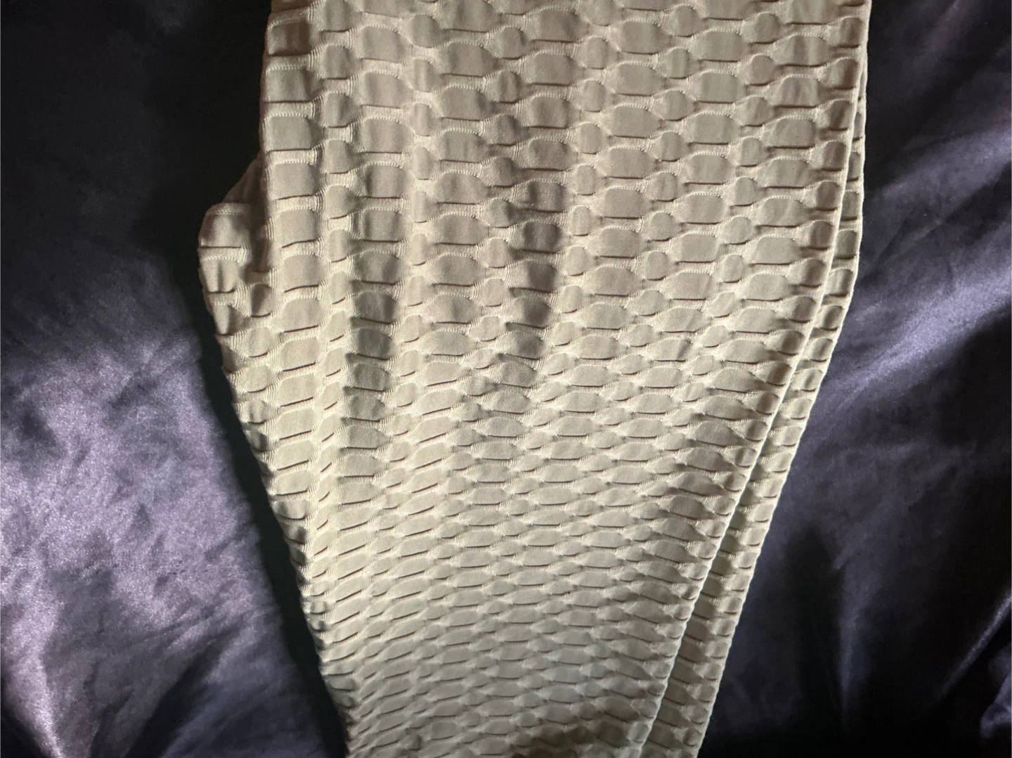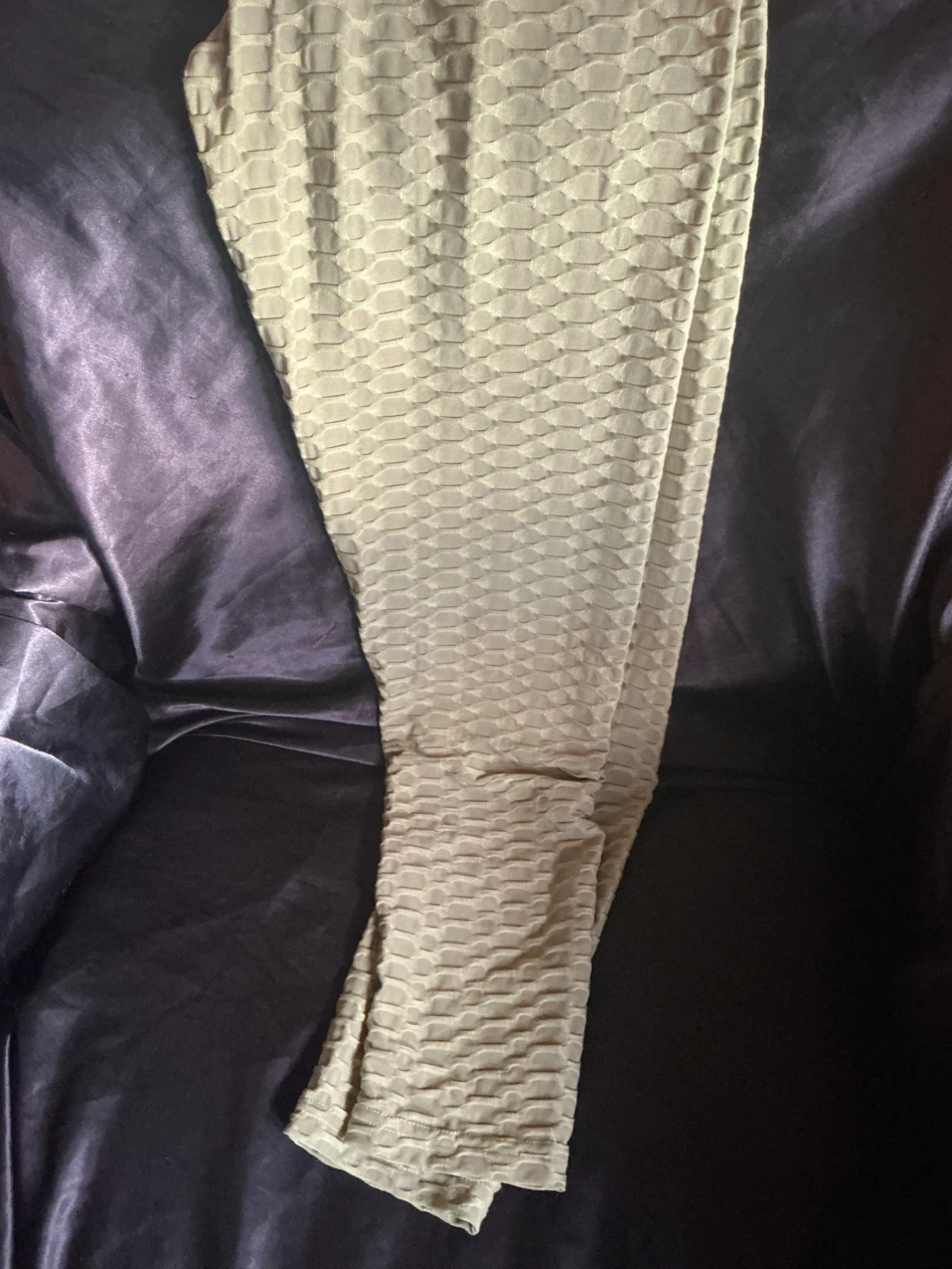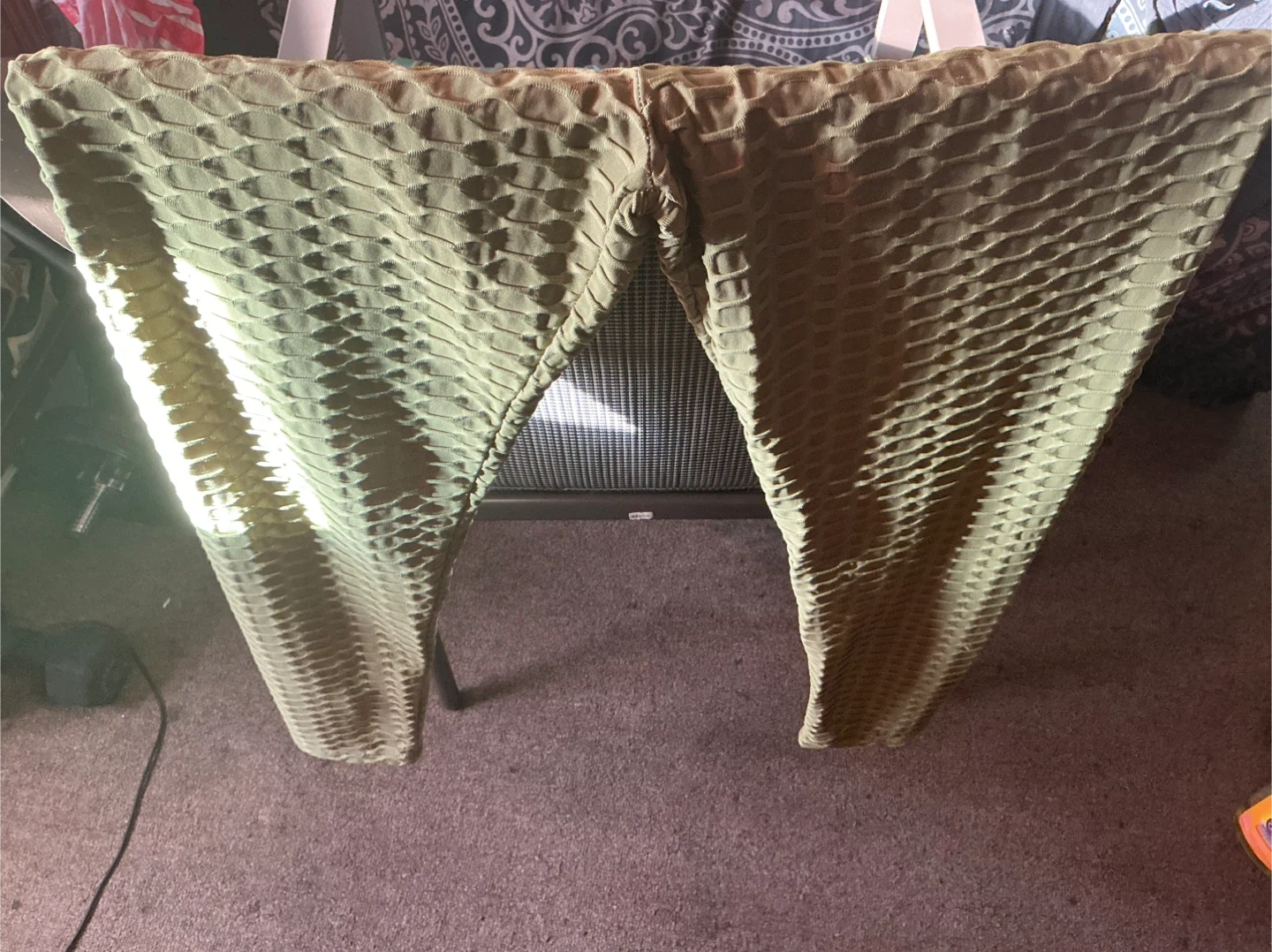 65These are a pair of textured leggings in an olive green color. They are to be made of a stretchy, comfortable material. Perfect for workouts or casual wear!
