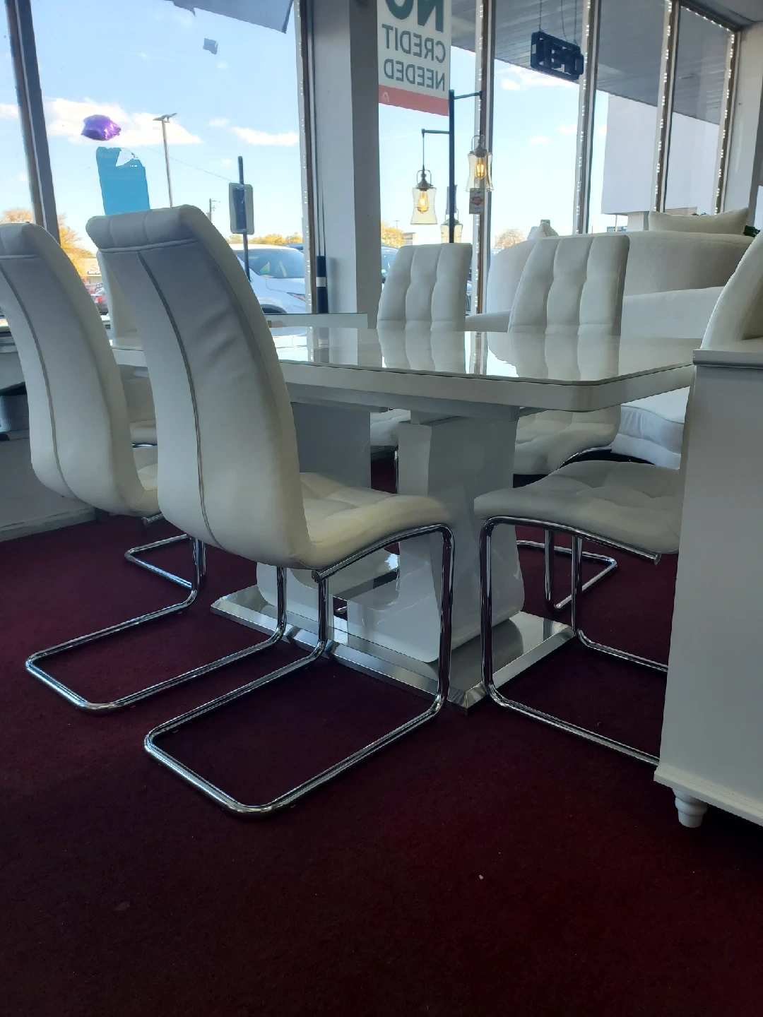 Selling a modern white dining table with matching chairs. The set features a sleek design with chrome accents on the chair frames. The table has a glossy surface, perfect for a contemporary dining space. Great for family meals or entertaining guests! table and 6 chairs