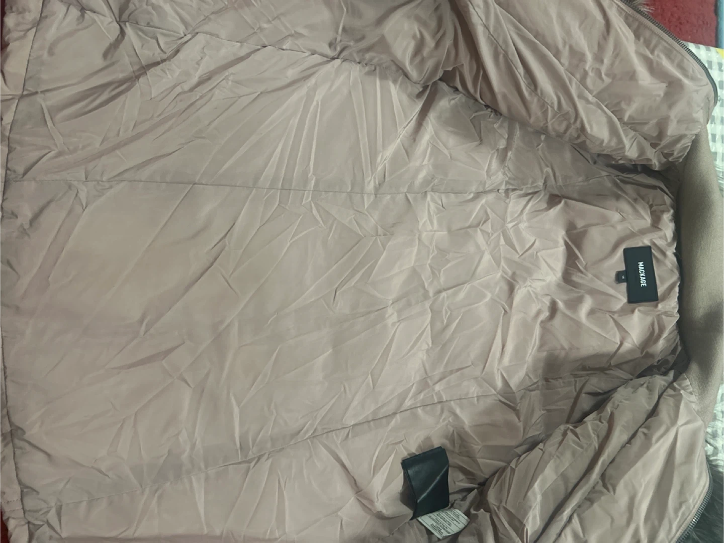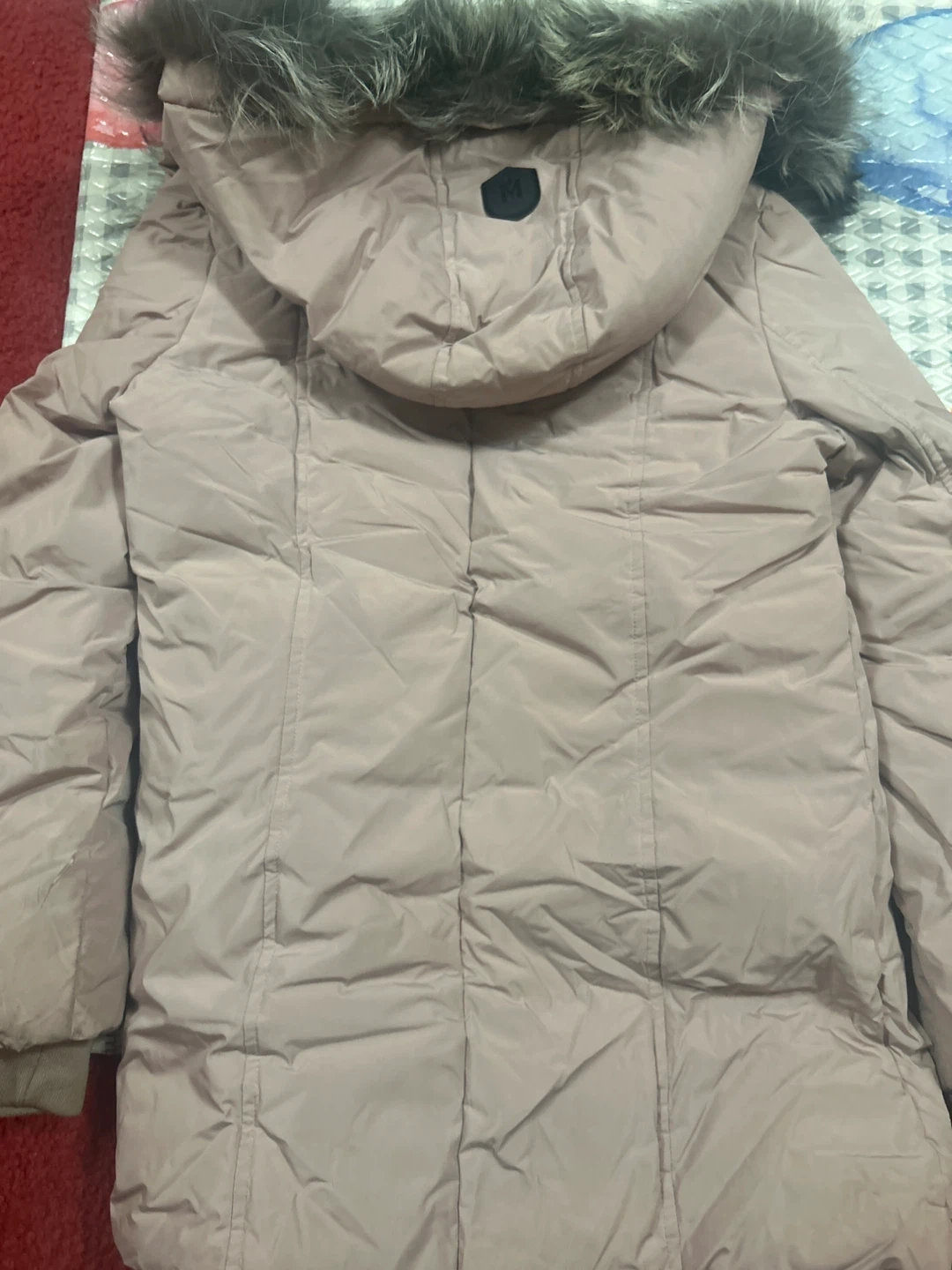 Selling a Mackage Keyereal down puffer coat in size 14. It's a stylish and warm coat perfect for the colder months! The coat features a fur-trimmed hood and sleek black accents. Color mauve