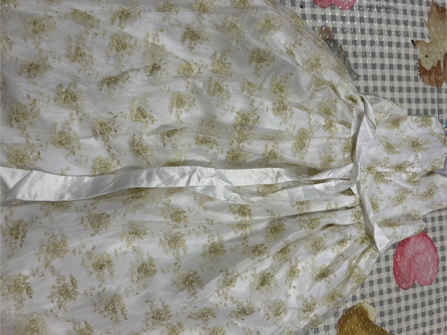 Gold and white embroidered flowers, prom or Christian or baptism dress with pearl and diamond waist trimming. Ankle length size 16 kids. New with tag!!!