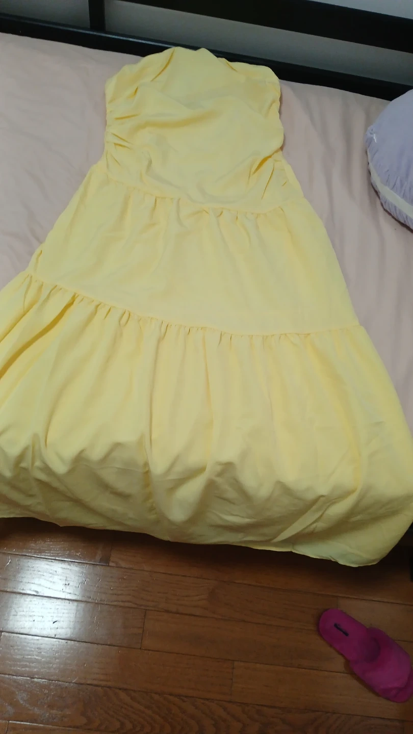 Here's a cute yellow strapless tiered dress! It's perfect for a sunny day out or a casual event. The tiered design adds a playful touch, and the strapless style keeps it breezy and fun