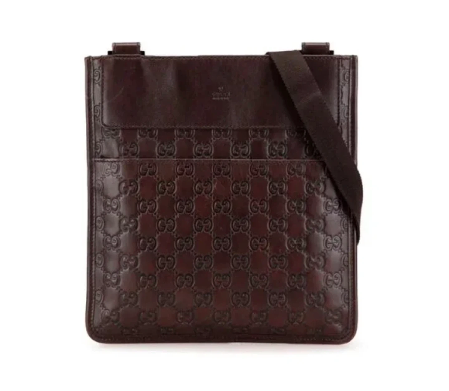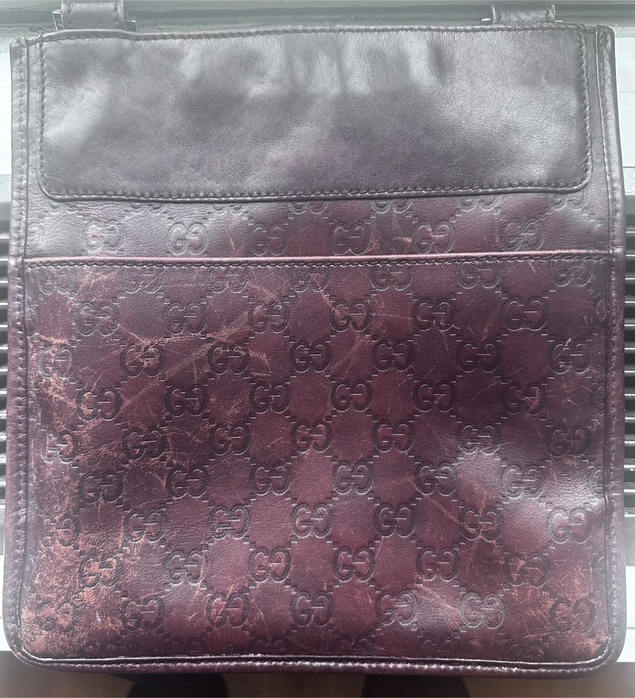 Vintage Guccissima / Selling a Gucci embossed leather messenger bag. It has a dark brown color and the classic Gucci pattern embossed throughout. There are some signs of wear, but overall it's still in good condition and has a lot of life left!