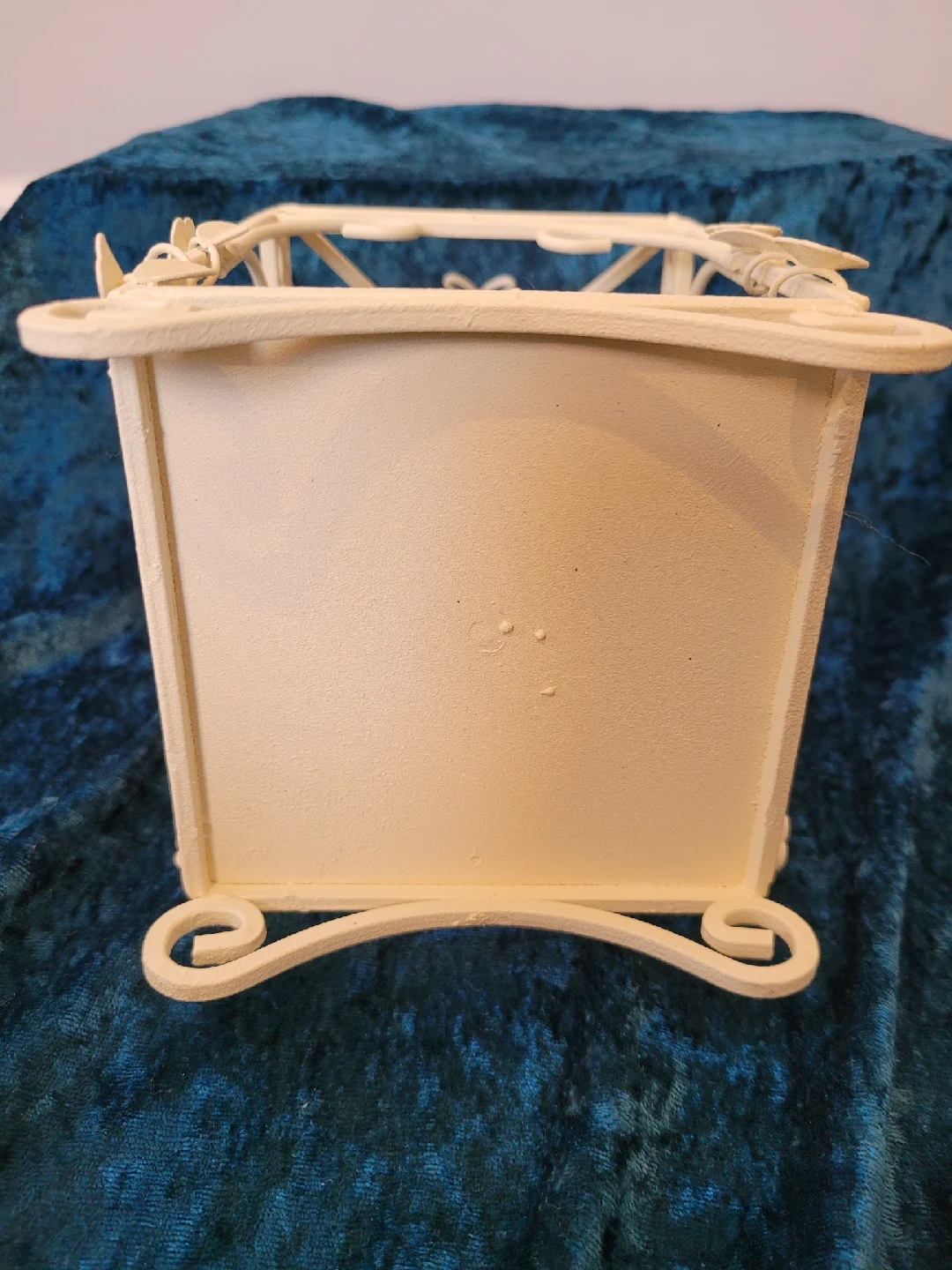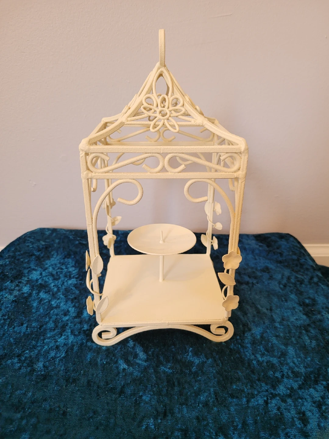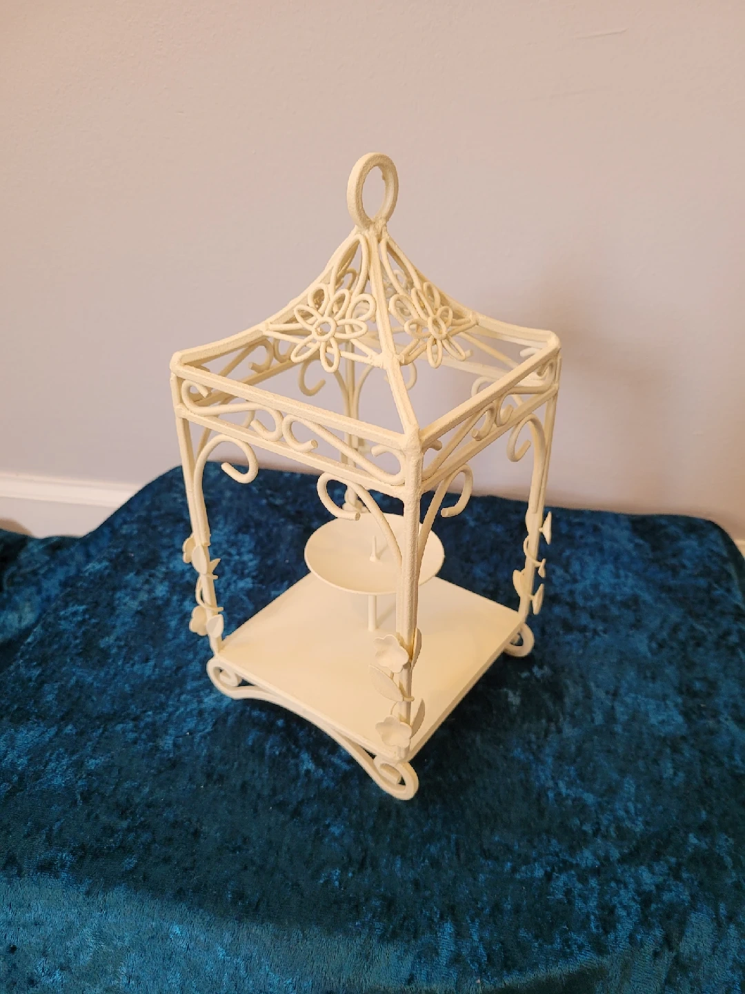 85This is a lovely cream-colored decorative metal lantern candle holder! It would be perfect for adding a touch of elegance to any room. It's in great condition and ready for a new home. Approximately 10" high x 5" wide. No candle included.