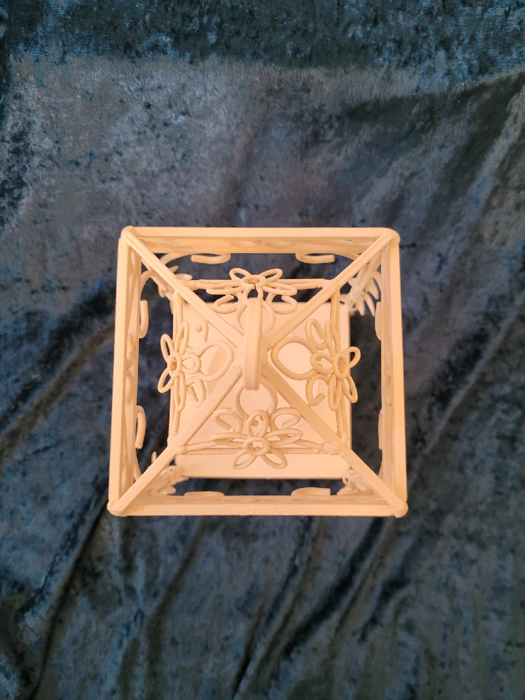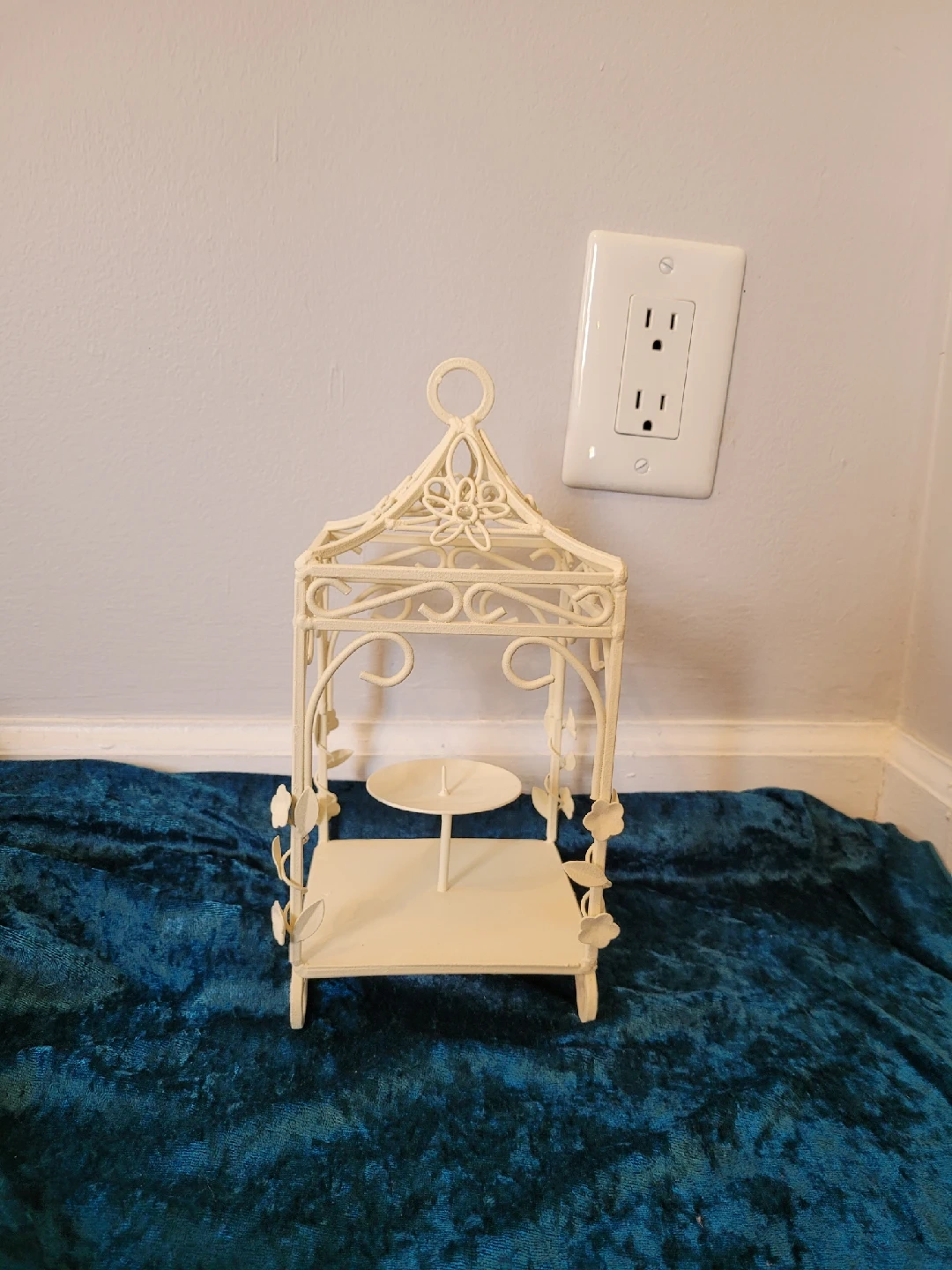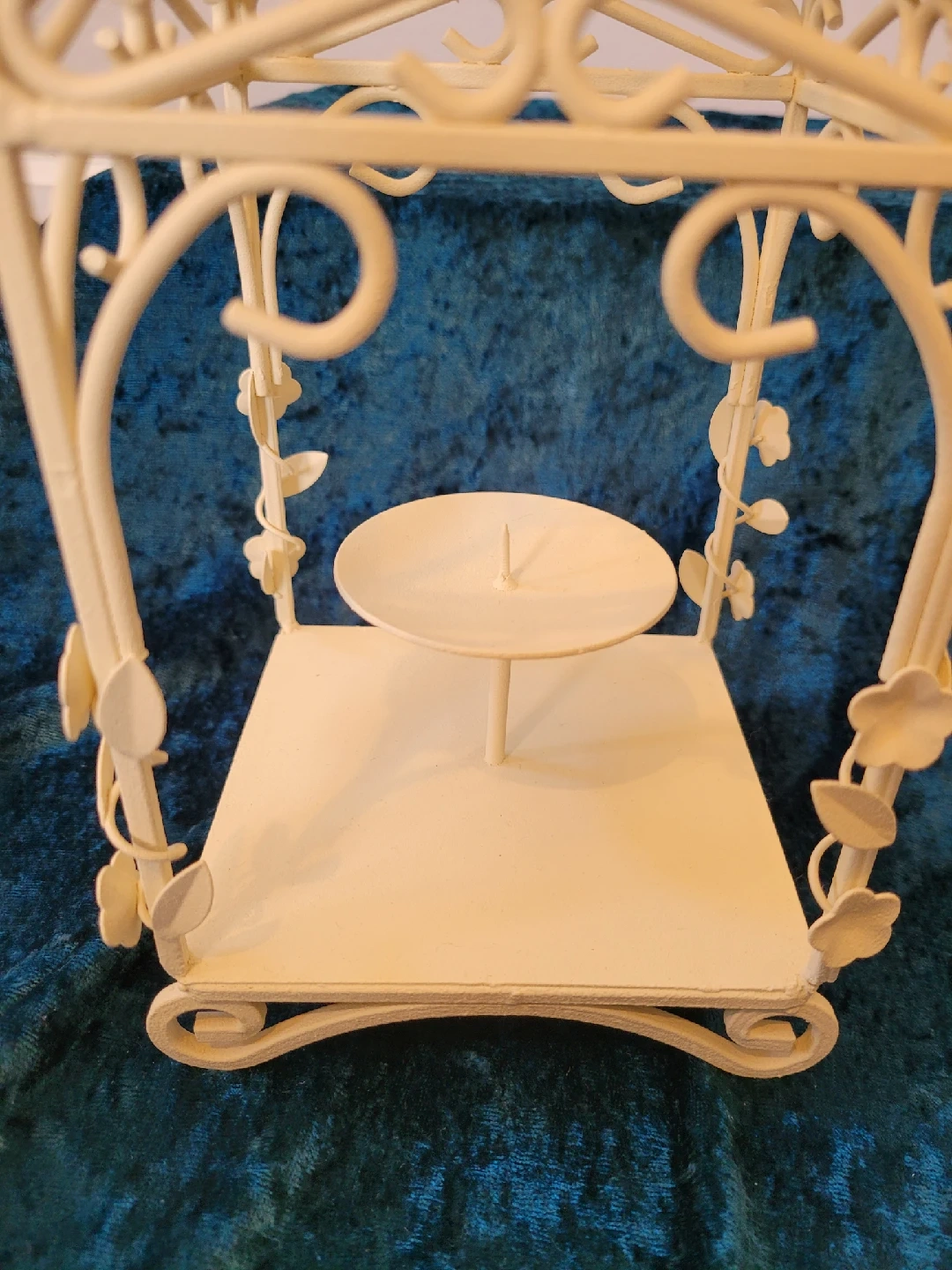 85This is a lovely cream-colored decorative metal lantern candle holder! It would be perfect for adding a touch of elegance to any room. It's in great condition and ready for a new home. Approximately 10" high x 5" wide. No candle included.