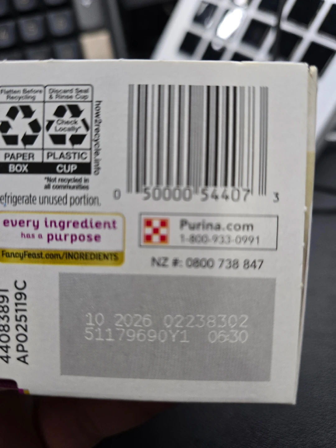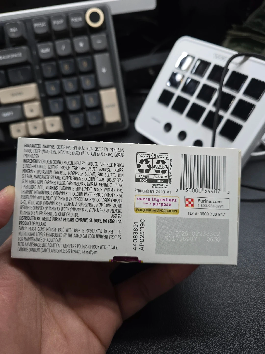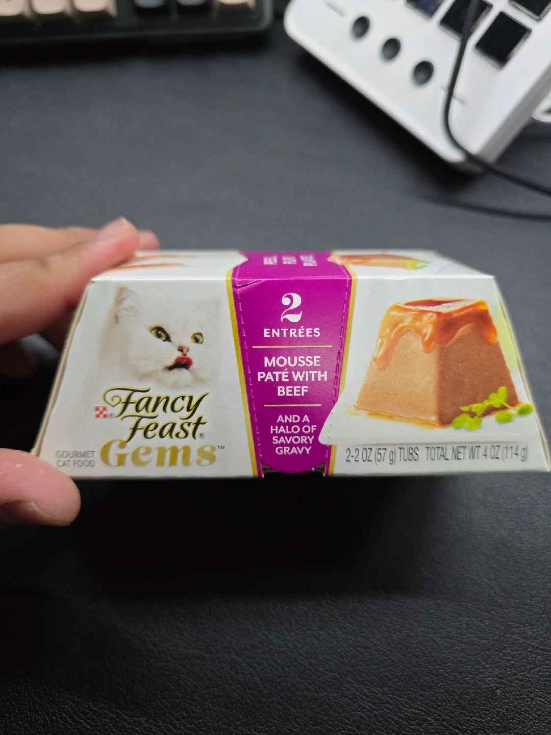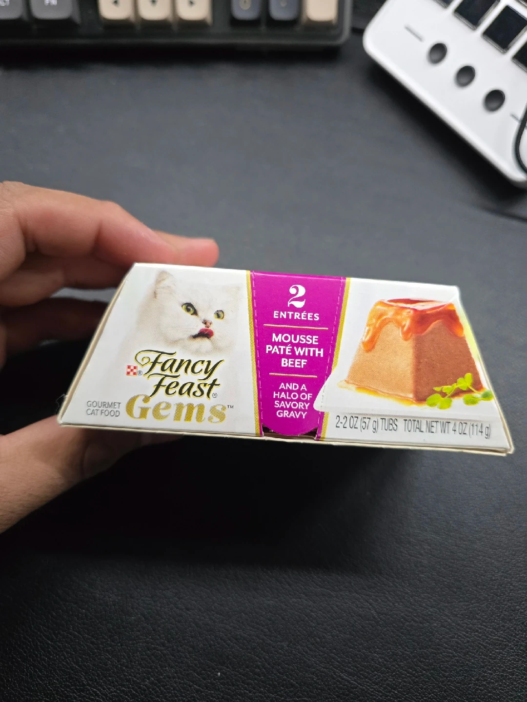 119Selling a box of Fancy Feast Gems Mousse Paté with Beef gourmet cat food. It contains 2 entrées, each 2-2.02 oz (57 g) tubs, for a total net weight of 4 oz (114 g). The expiration date is 2026 October 10