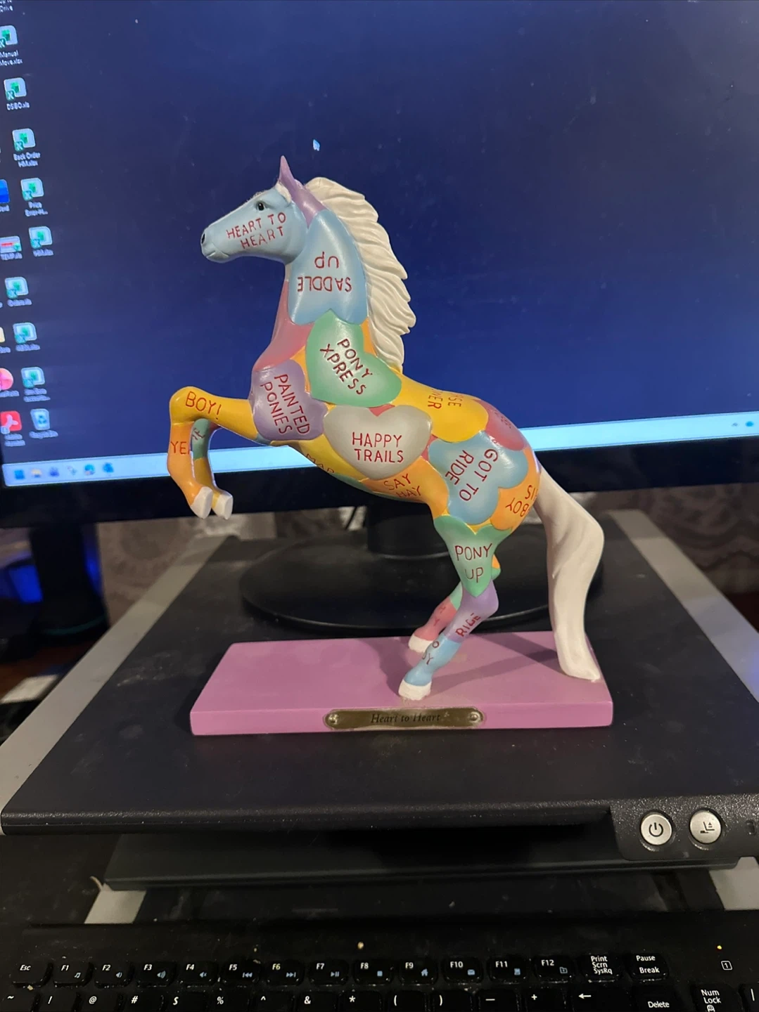 Selling a Trail of Painted Ponies figurine, the "Heart to Heart" model. It's a colorful and unique piece, perfect for collectors or anyone who loves horses. The base has a plaque that also says “Heart to Heart”.