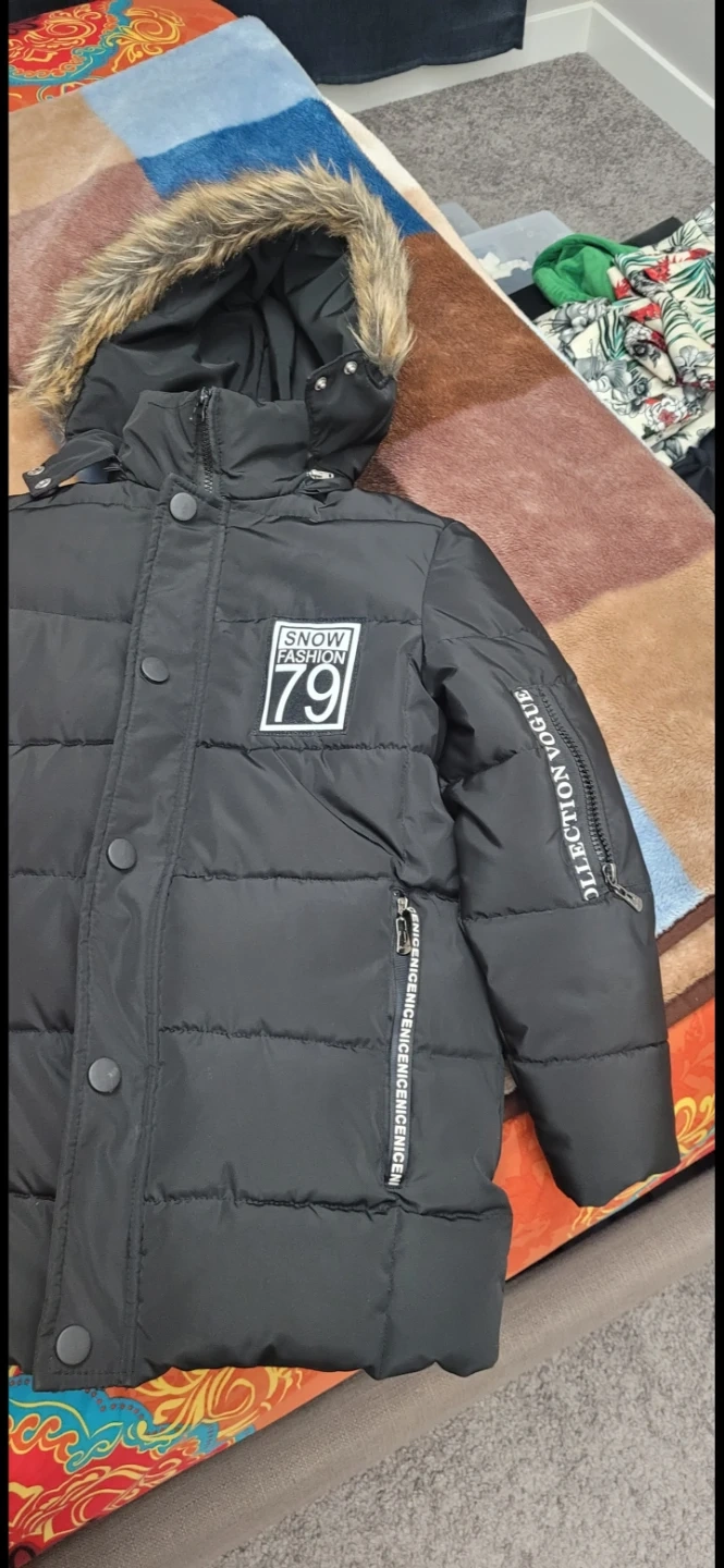 Selling a black puffer unisex jacket with a 'Snow Fashion 79' design. It's in great condition and perfect for staying warm!