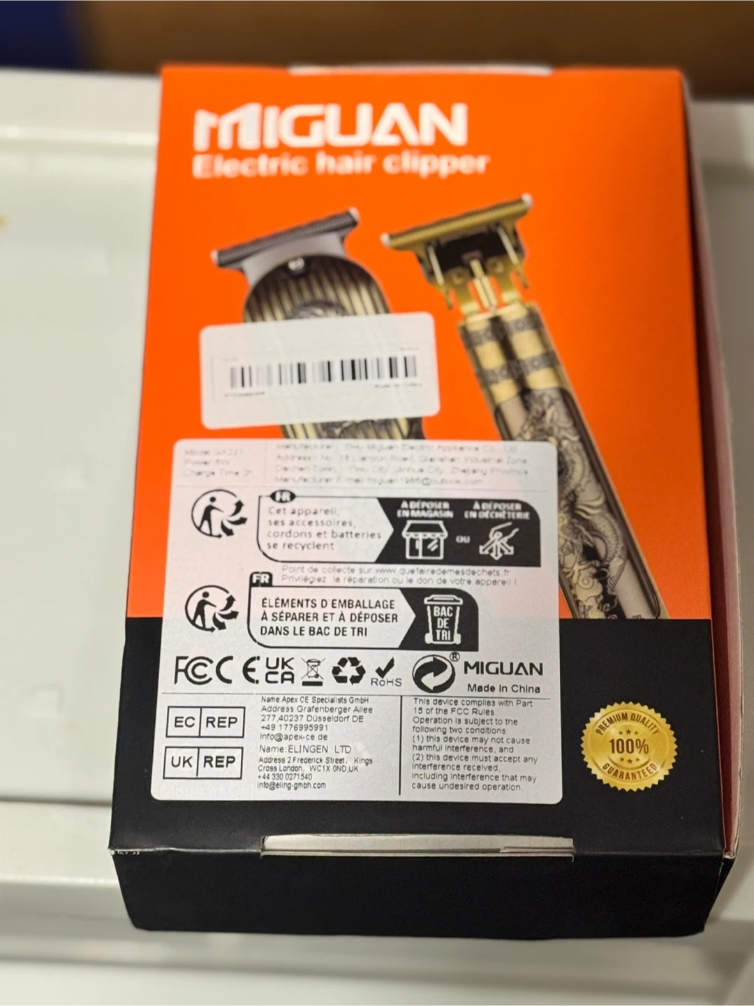 Selling a brand new MIGUAN electric hair clipper set! It comes in its original box and includes all the components. Features a high-performance lithium battery and an LED display to show the charge and battery status. Great for a precise and stylish trim!