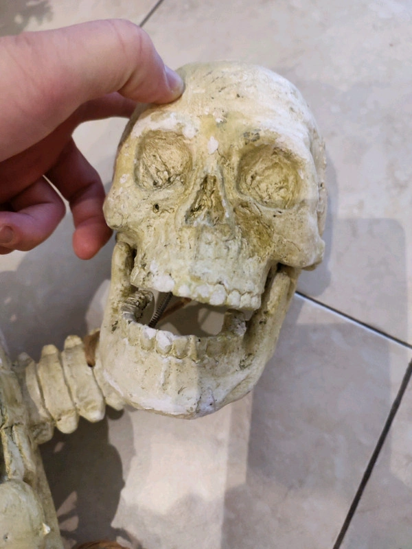 Real looking adult human sized skeleton for $60. The bones feel real, it's not cheap plastic. Grim Reaper style skeleton for $10. Halloween lights for $10. Or everything for $75.
