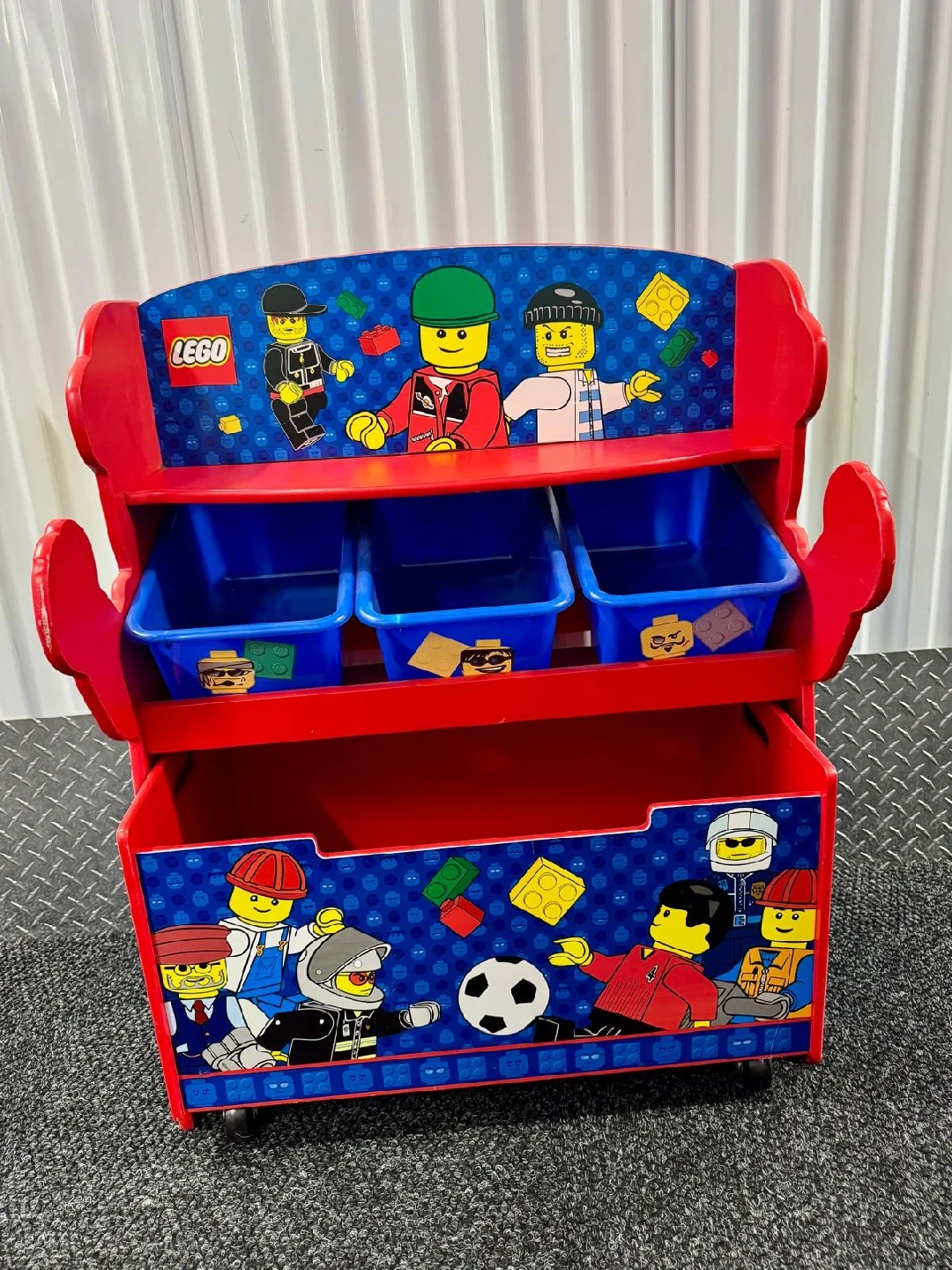 Here's a fun and functional LEGO kids' storage organizer! It features colorful LEGO character designs and provides a great way to keep toys and books neatly organized. It has a two-tier design with bins and a drawer.