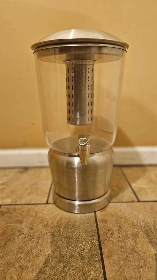 65This 4.5 Gallon TableCraft Beverage Despenser is great! Internal core can be filled with ice to keep the liquid cold. It can also be removed to act as an infuser. Place tea or fruit inside to add some flavor. It is stainless steel except for the bason which is plastic. You can see on the top back lip that it has a flaw but does not affect function and is barely visible when lid is on. Don't miss out on being able to despense your drinks!