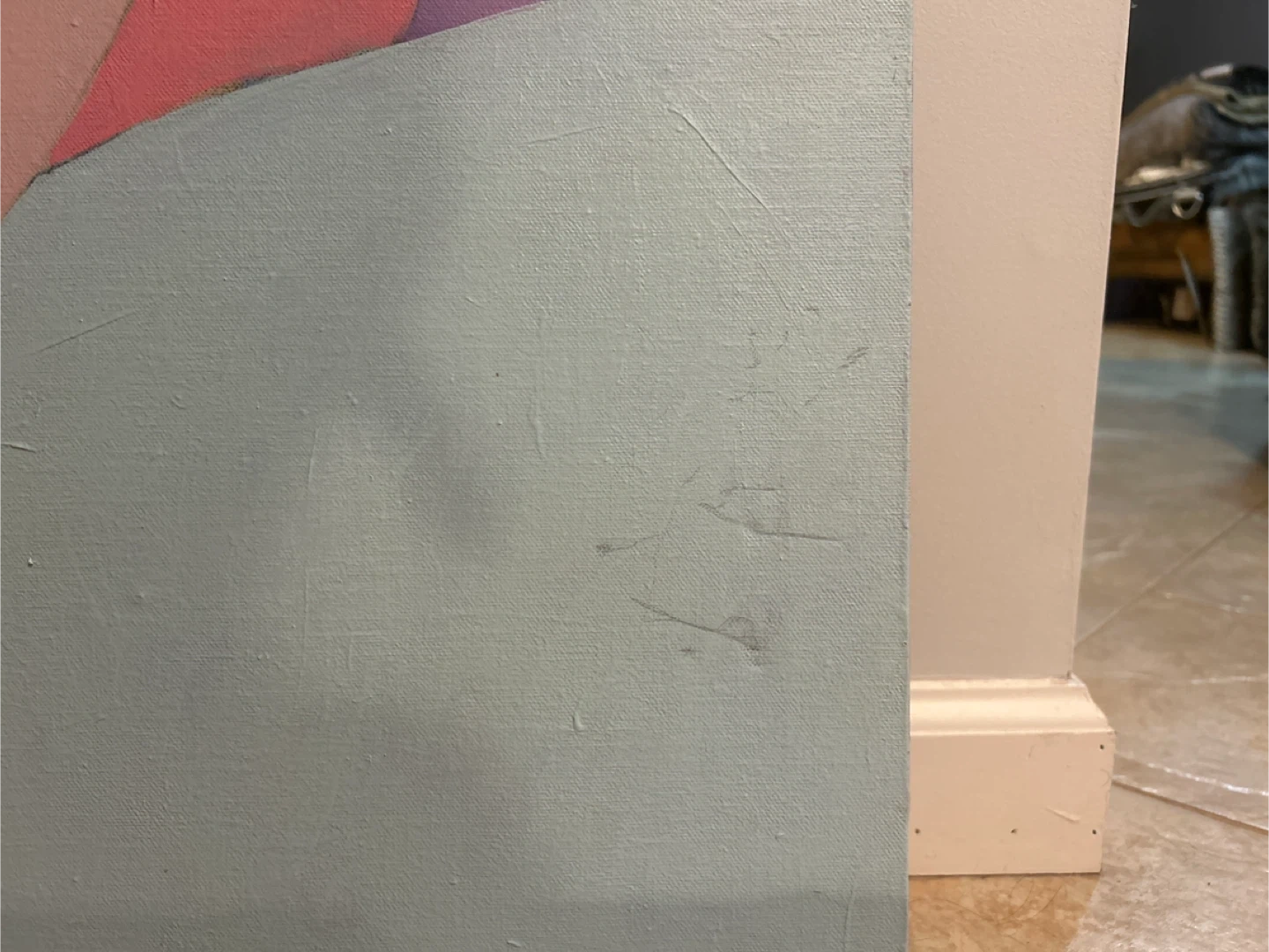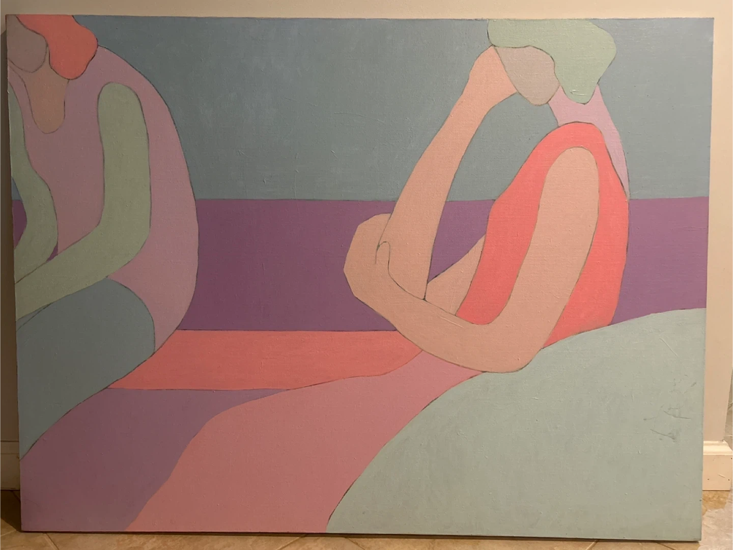 A Modernist Style Abstract Painting of two “Female Figures”, This is a unique abstract painting with a calming color palette. It features figures in shades of pink, green, and blue, creating a serene and artistic vibe. Perfect for adding a touch of modern art to your space!