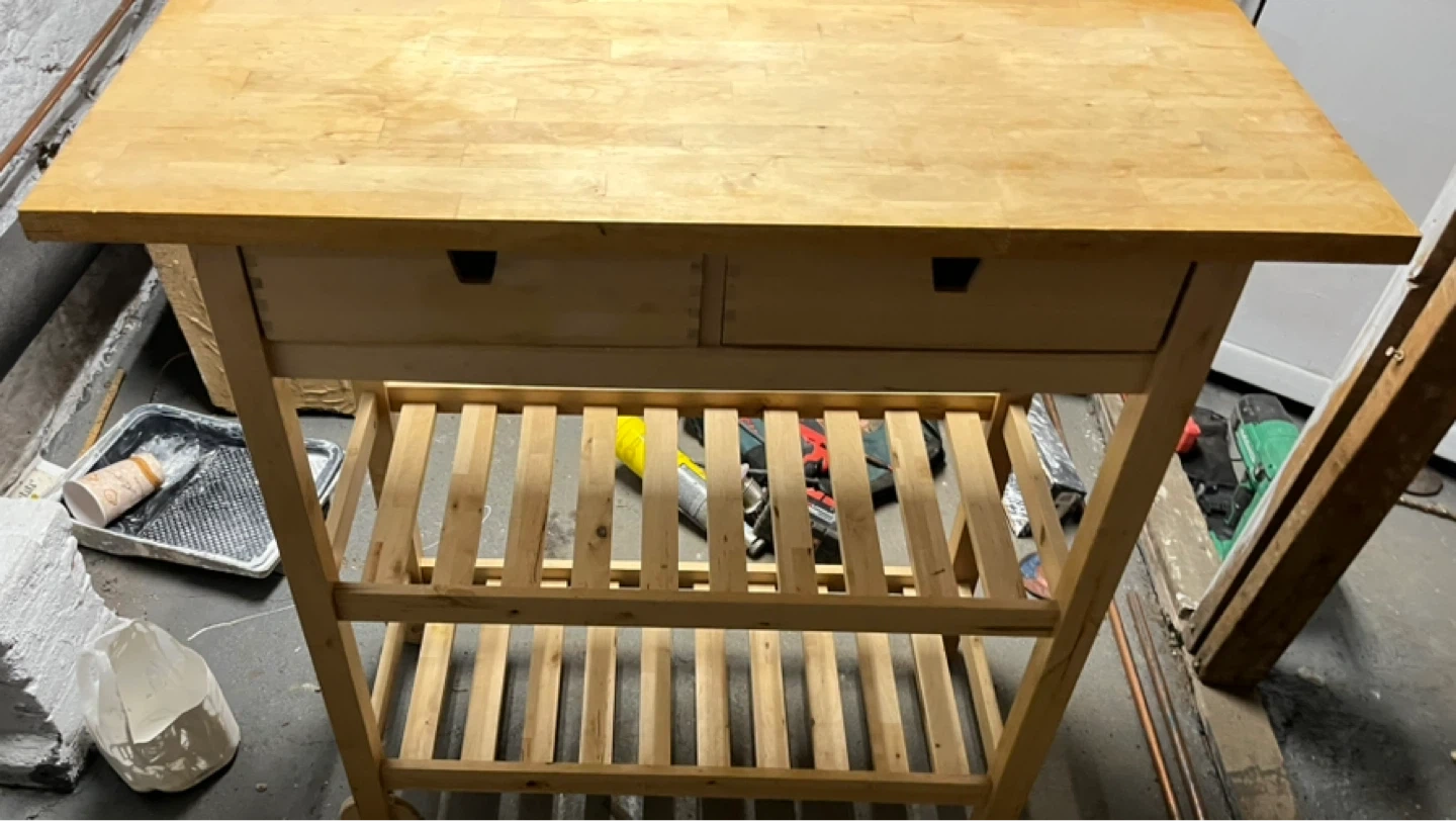 Selling a used Ikea Bekvam kitchen cart. It's perfect for adding extra storage and workspace to your kitchen. It features a solid wood countertop, two drawers, and two shelves for storing kitchen essentials. Great for small spaces!