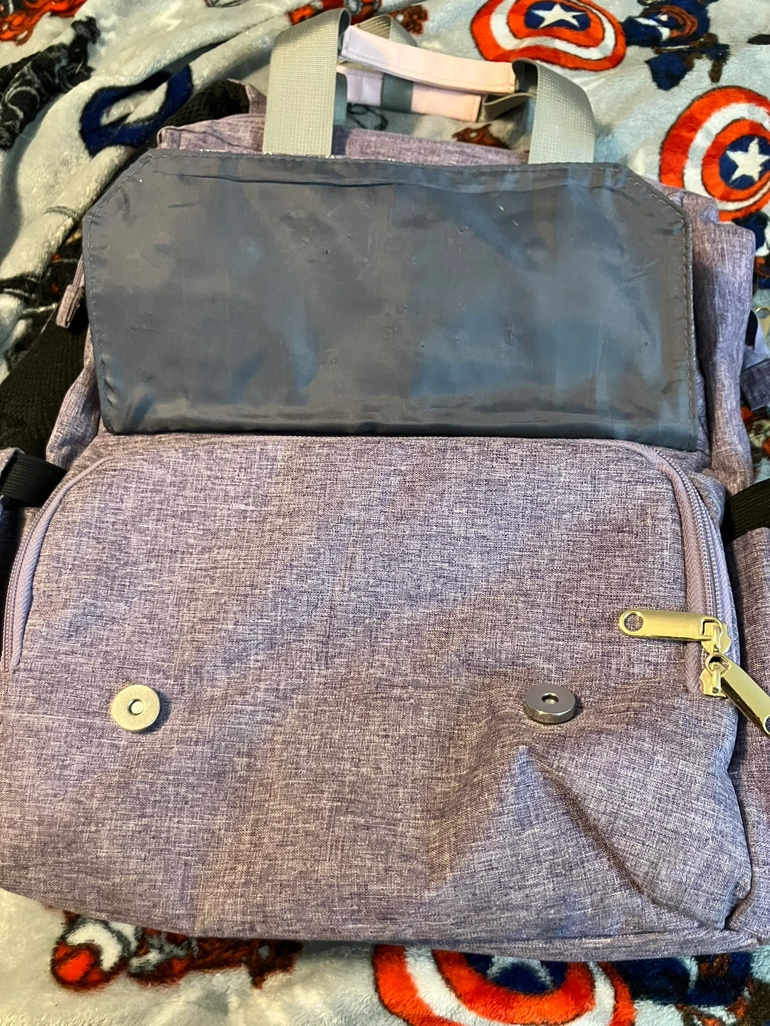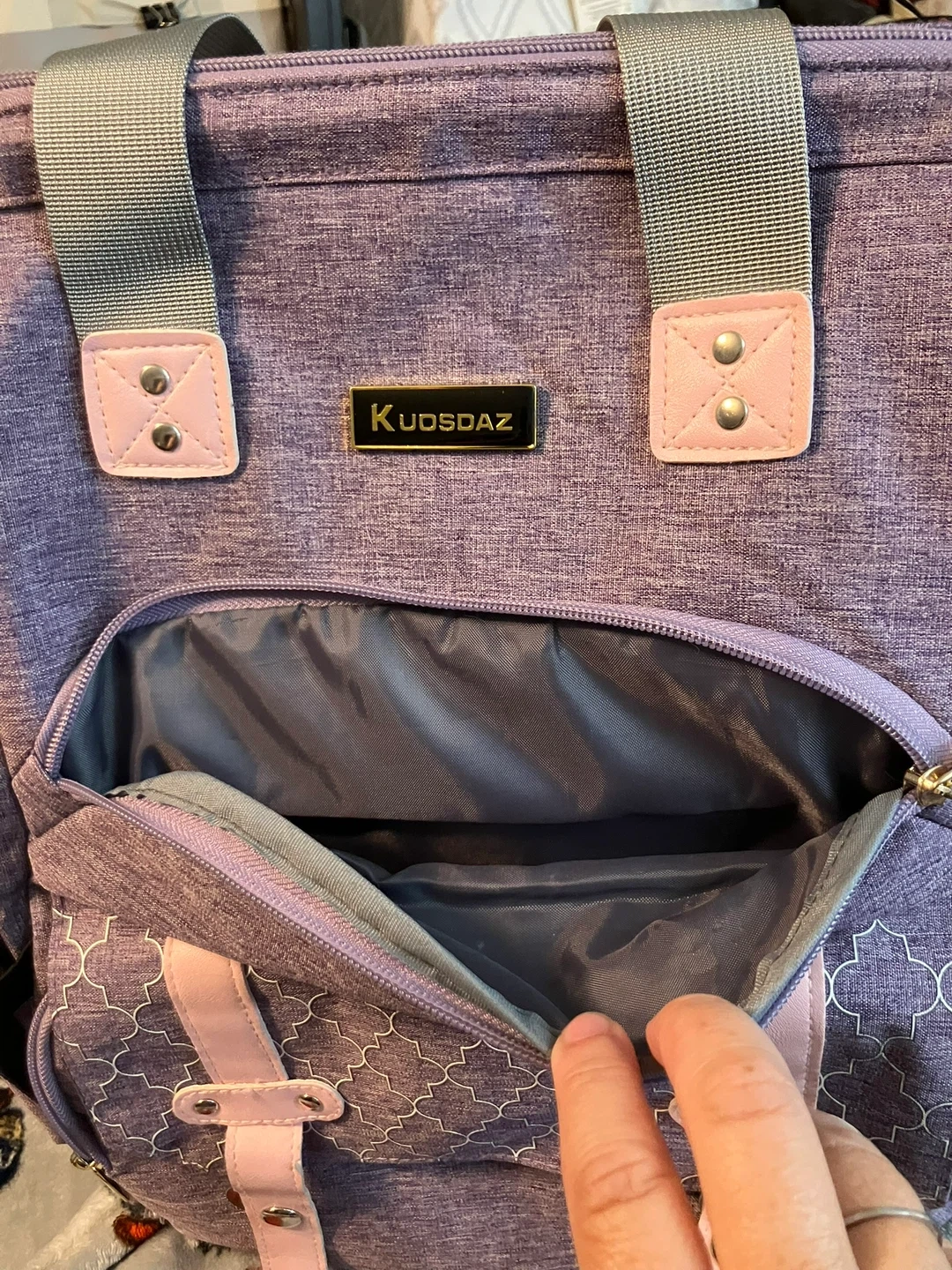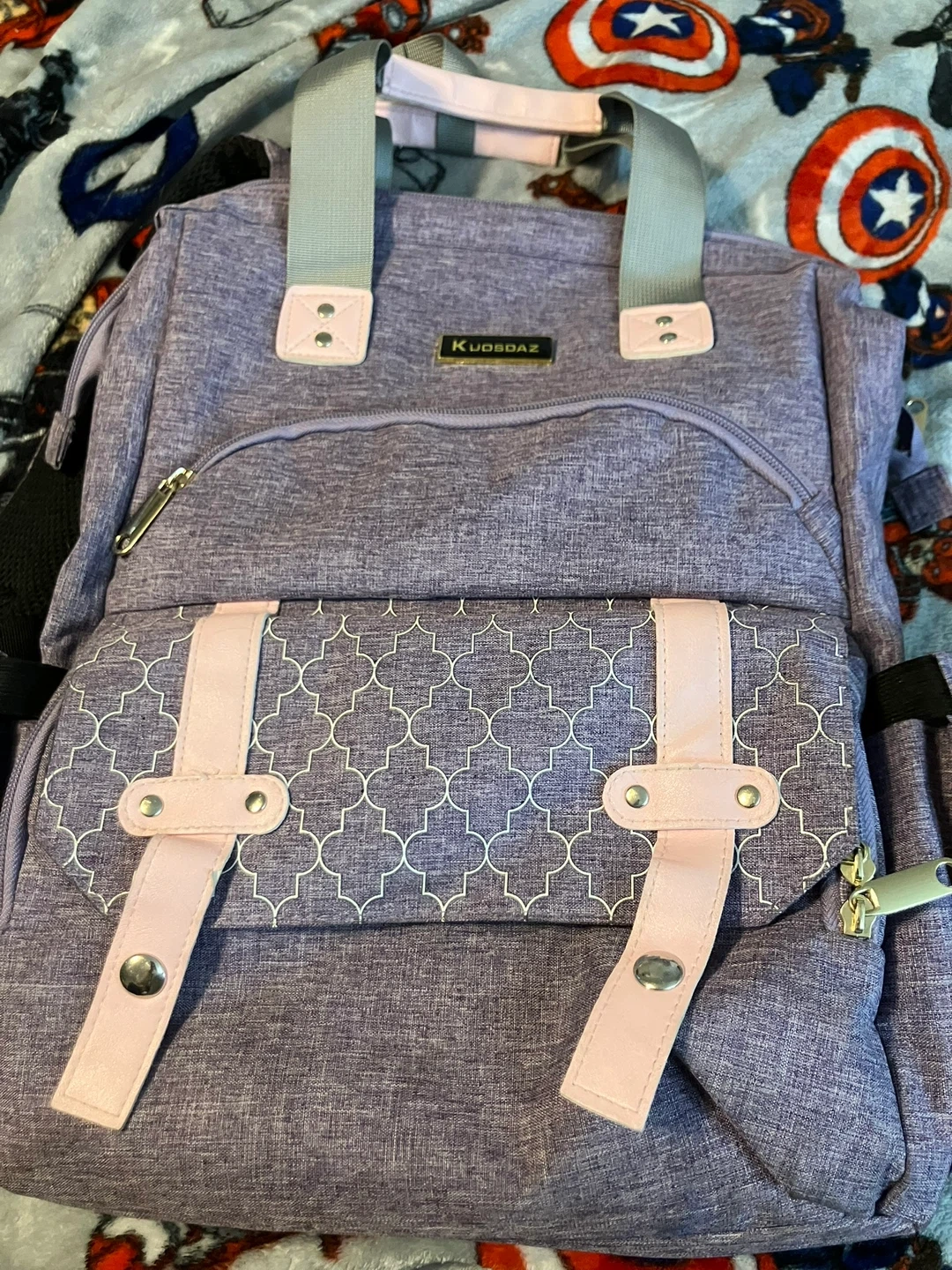 15Here's a Kudsaz diaper bag backpack in a lovely purple color! It features multiple compartments to keep everything organized. It's in great condition and ready for a new home