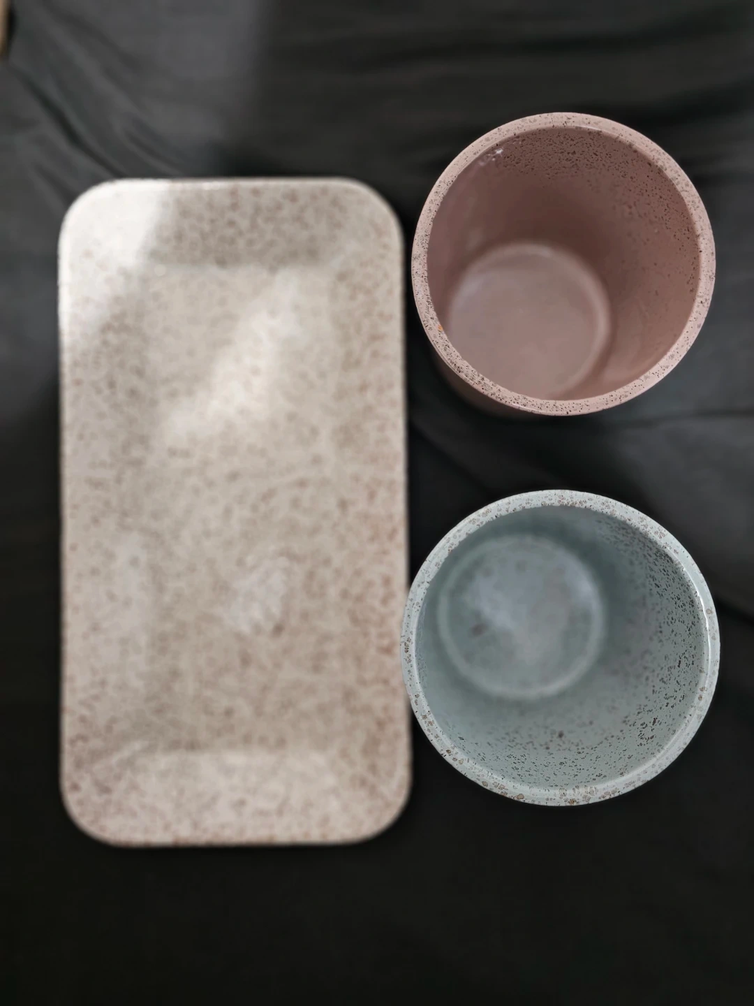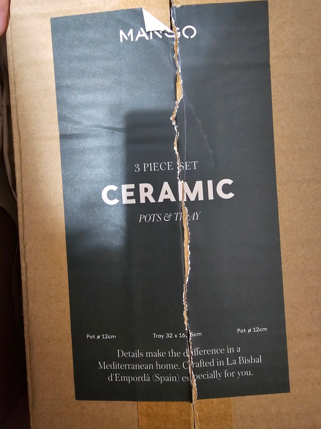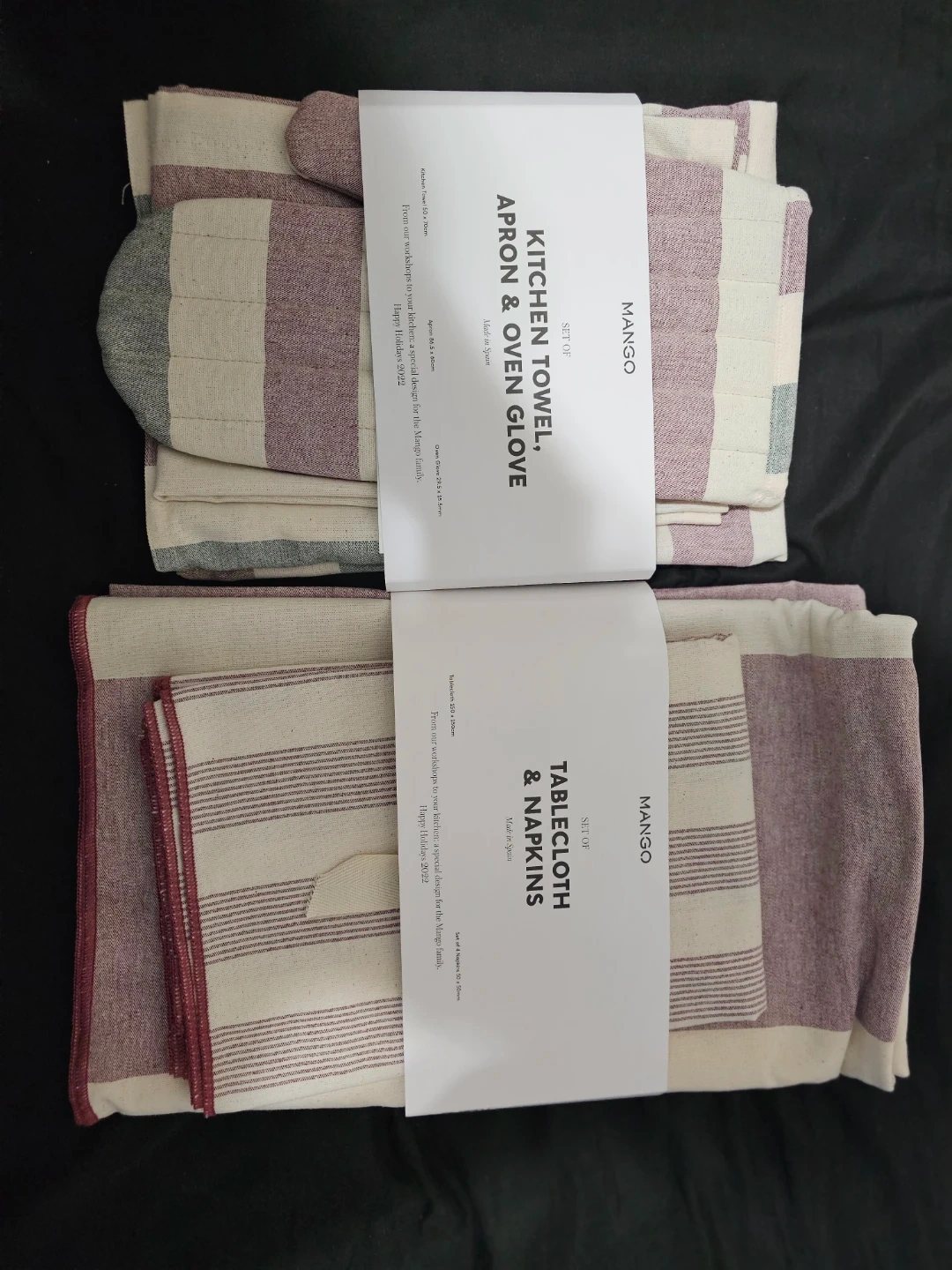Selling a set of Mango kitchen textiles, including a kitchen towel, apron, and oven glove. Also including a 3 piece ceramic pot and tray set. The kitchen set is from the workshops, a special design for the Mango family, Happy Holidays 2022.