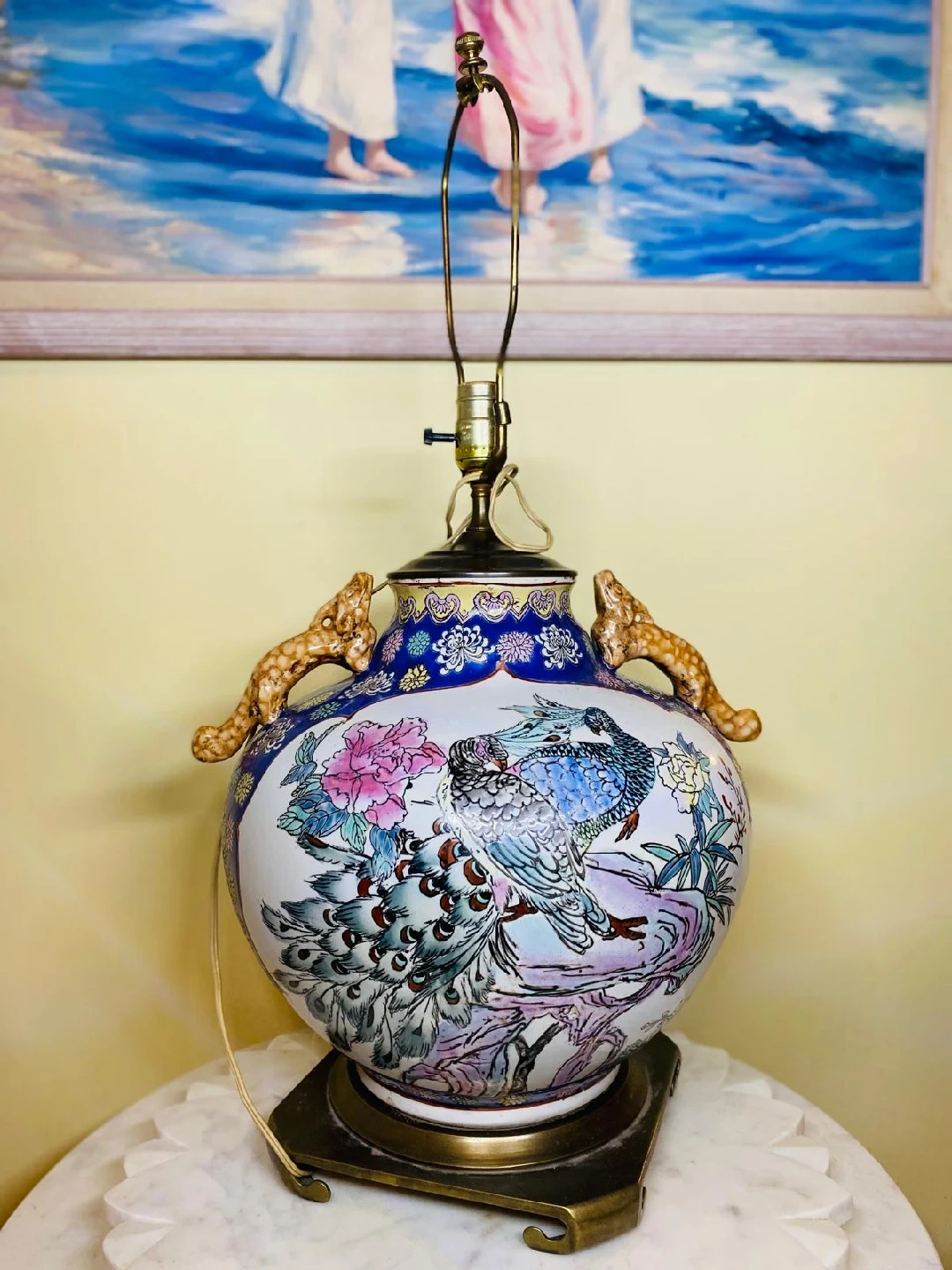 Selling a beautiful vintage vase lamp! It features a vibrant floral and peacock design with unique dragon-shaped handles. The lamp measures approximately 11 inches in diameter and 15 inches in height. A lovely addition to any room!