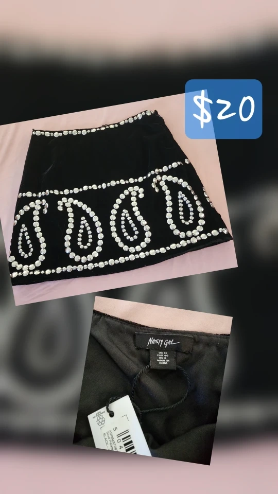 60Selling a cute Nasty Gal black mini skirt! It has a paisley design with silver embellishments. The size is L and it's in great condition! ¡ | !