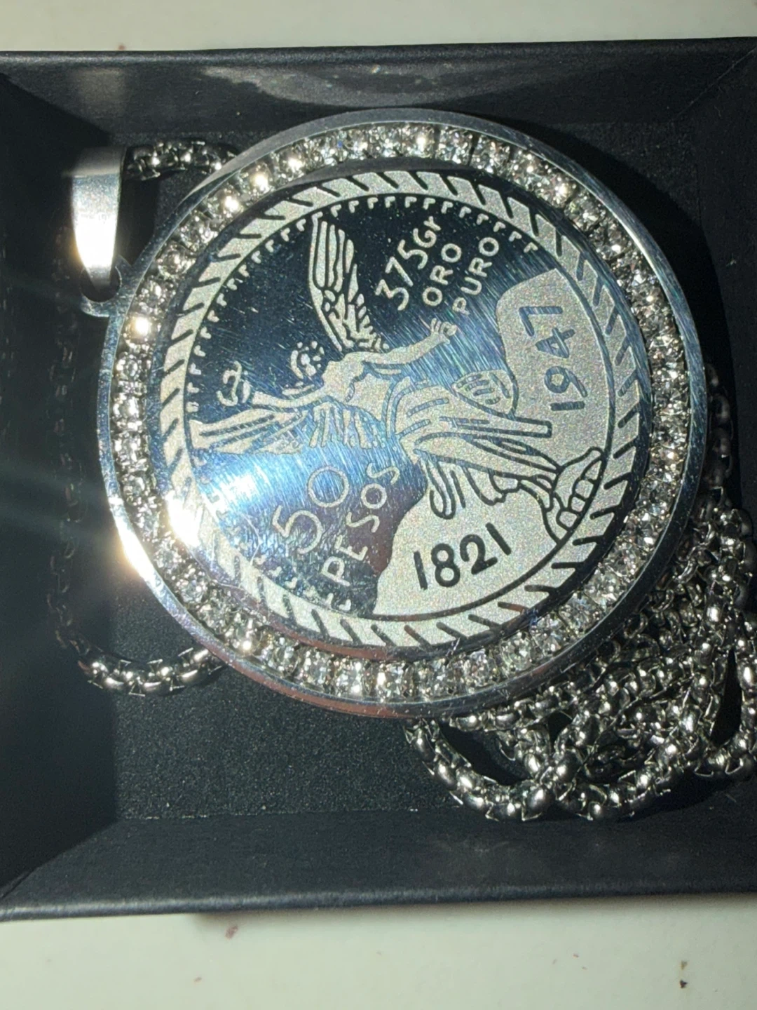 Here's a unique pendant necklace featuring a 50 Pesos gold coin design. The coin replica displays '3.75gr ORO PURO' and the year '1947' along with '1821' and '50 PESOS'. It's surrounded by sparkling stones and comes with a silver chain. A really striking and eye-catching piece!
