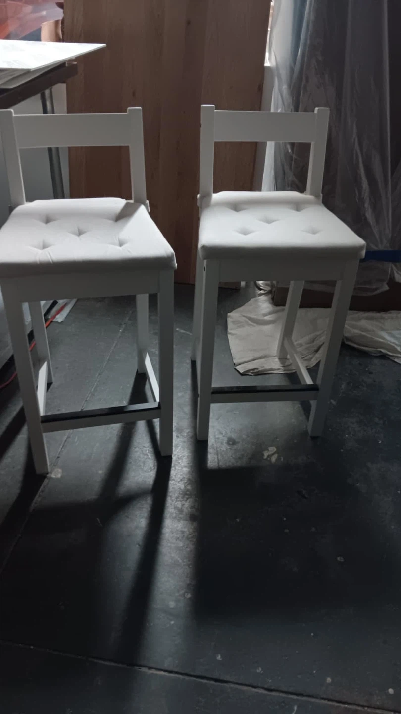 Selling a set of two bar stools! They feature a clean, white wooden frame with a cushioned seat. Perfect for adding a touch of simple elegance to your kitchen or bar area. They are in good condition and ready for a new home!