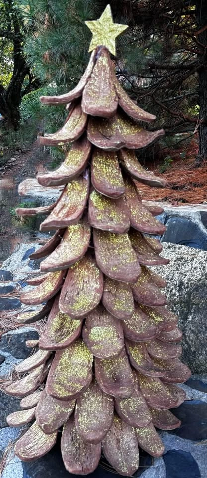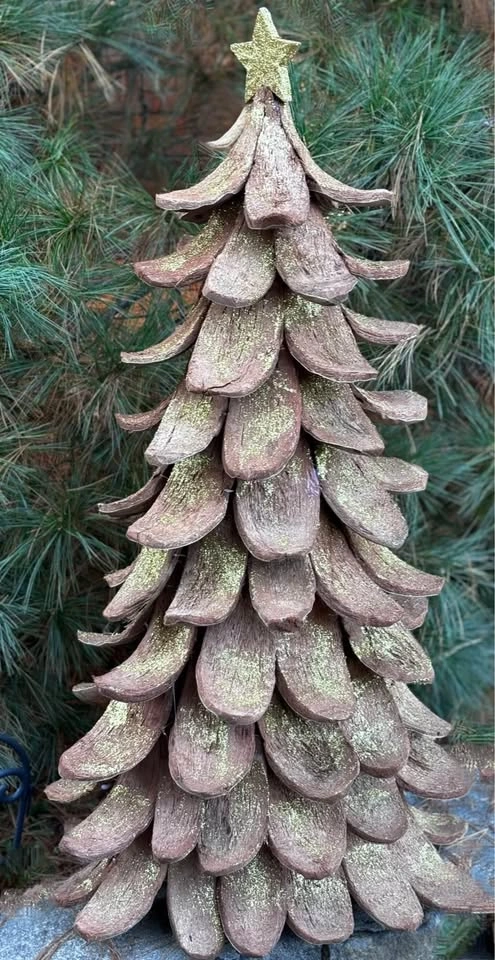 Whimsical Christmas Tree - Wood Bark Golden Glitter Star