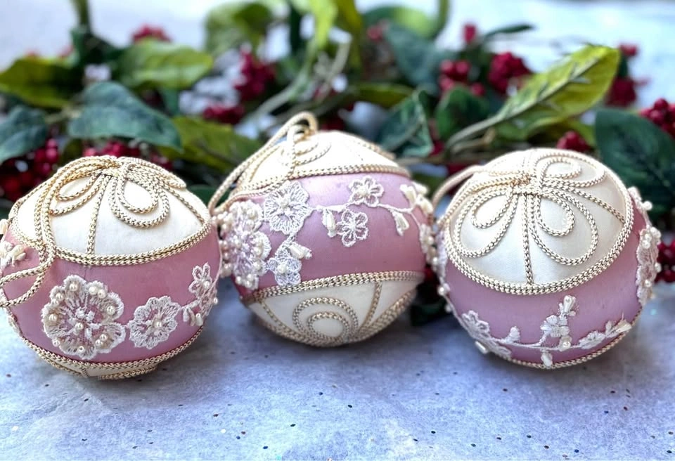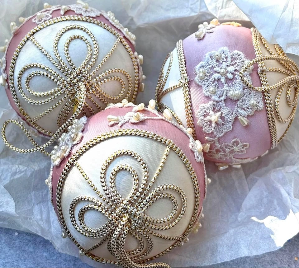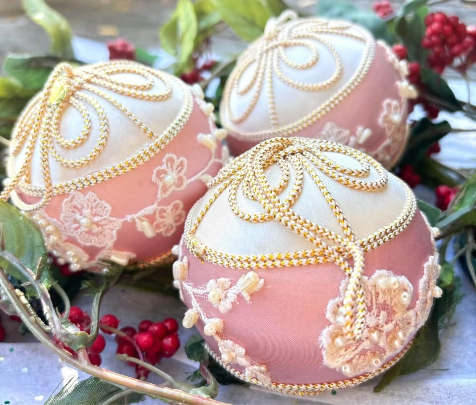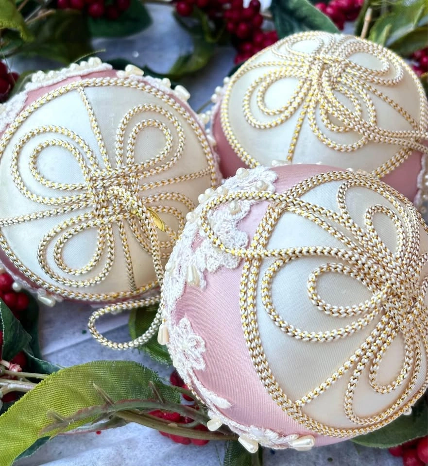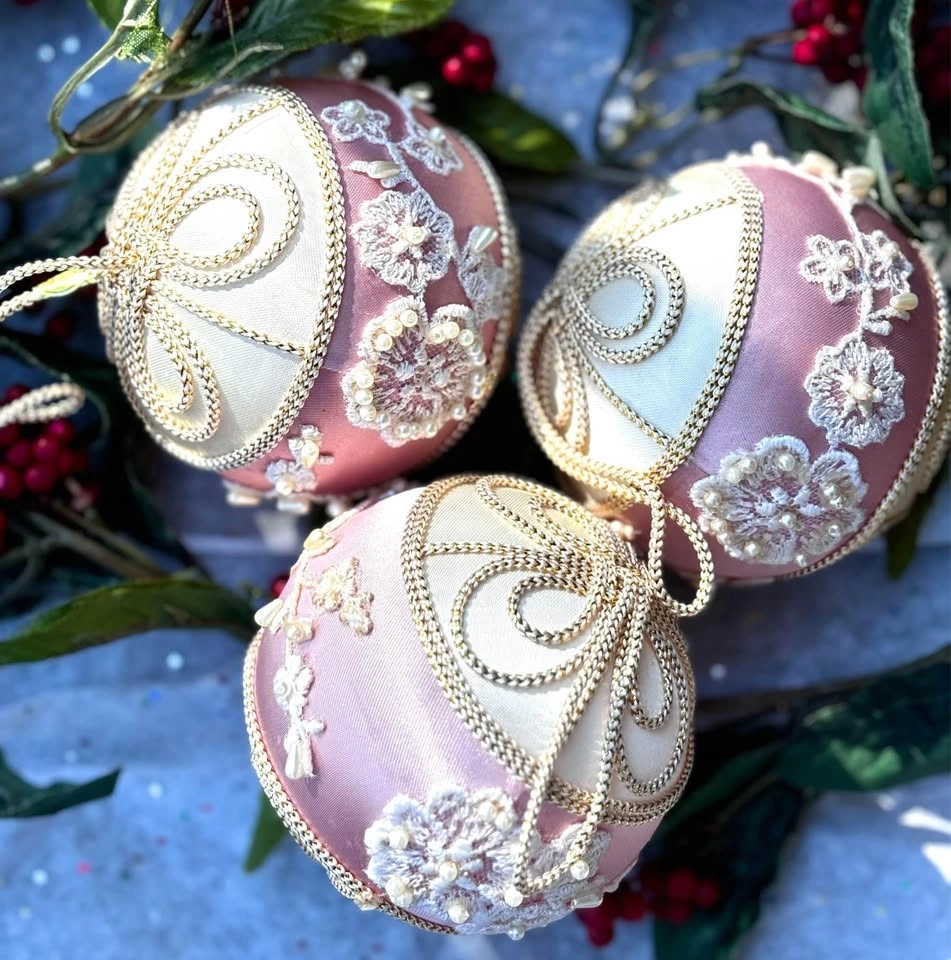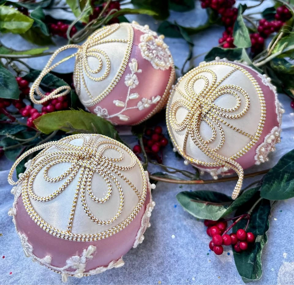 Vintage Pink & White Satin & Pearl Large Round Ornaments. $18 each, 3 available. Like New / Never Used. Handcrafted and intricately designed ornaments wrapped in pink & white satin, adorned with embroidered florals, pearls and braided gold & white fabric. Gold & white braided string for hanging directly on tree or with a hook. 3.5" W x 3.5” H. Let me know if you're interested!