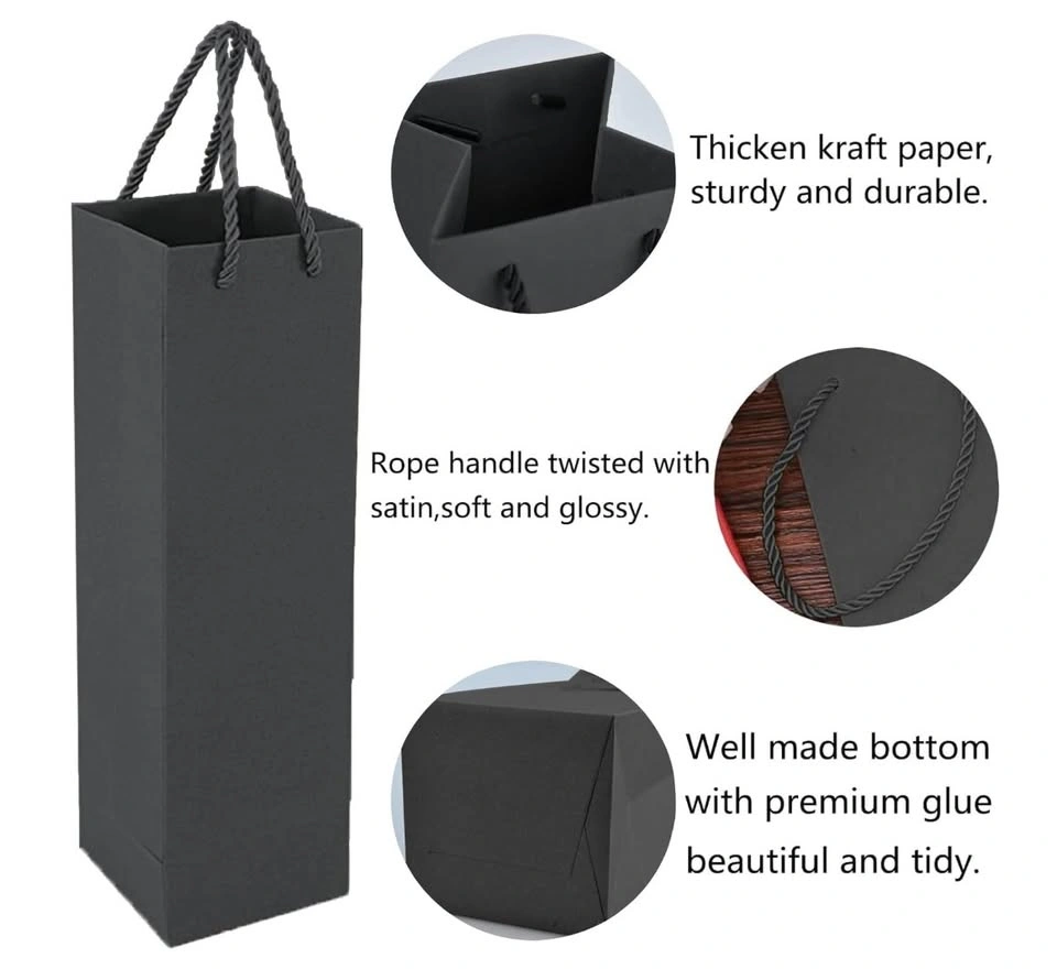 25 Pack Black Wine Gift Bags, 13.8 x 3.7 x 3.5 Inch Wine Tote Bags Bulk Kraft Paper Wine Gift Bags with Handles, Wine Bottle Paper Bags Retail bags for Christmas, Party, Shopping, Wedding