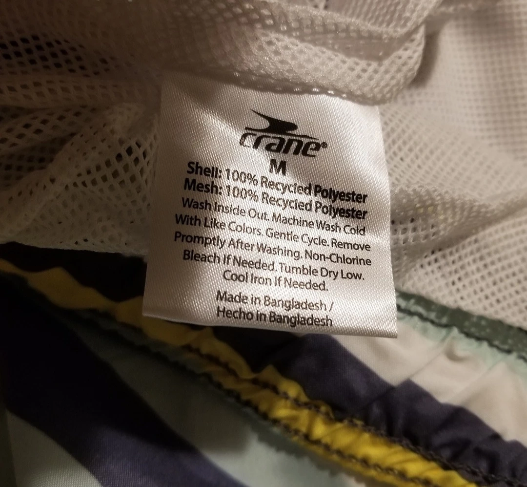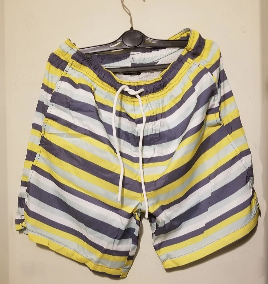 Selling a pair of Crane swim trunks in size M. They feature a striped pattern with yellow, gray, and white colors. The shell and mesh are made of 100% recycled polyester.