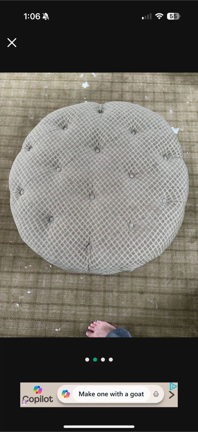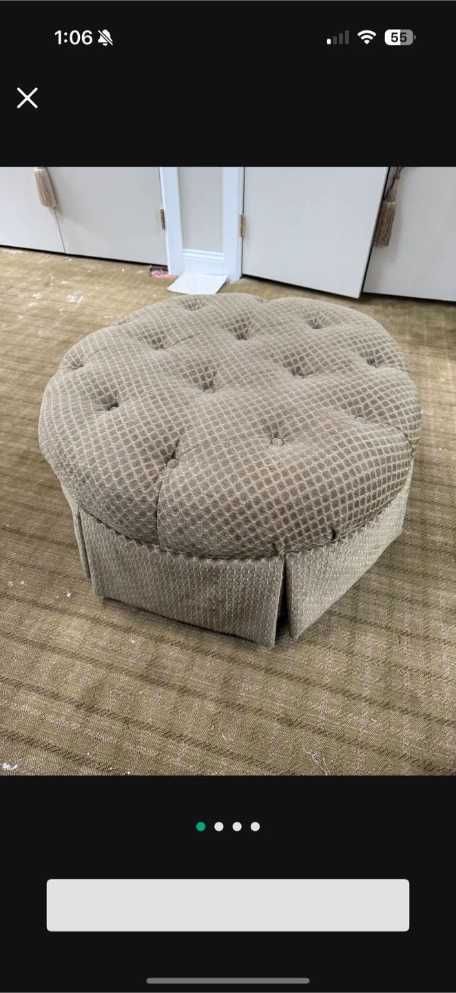 Selling a round tufted ottoman in good condition. It has a neutral color and a button-tufted top. Great as a footrest or extra seating!