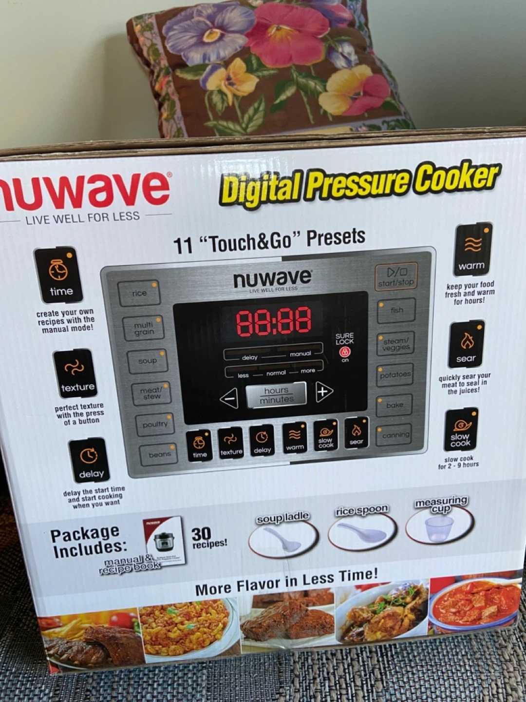 Selling a brand new NuWave Nutri-Pot 6Q Digital Pressure Cooker! It's never been used and comes in the original box. This pressure cooker features: - 6-quart capacity - Cool-to-touch insulated, removable lid - Sure Lock safety technology - Cooks up to 70% faster - One-touch cooking Package includes manual and recipe books, soup ladle, rice spoon and measuring cup