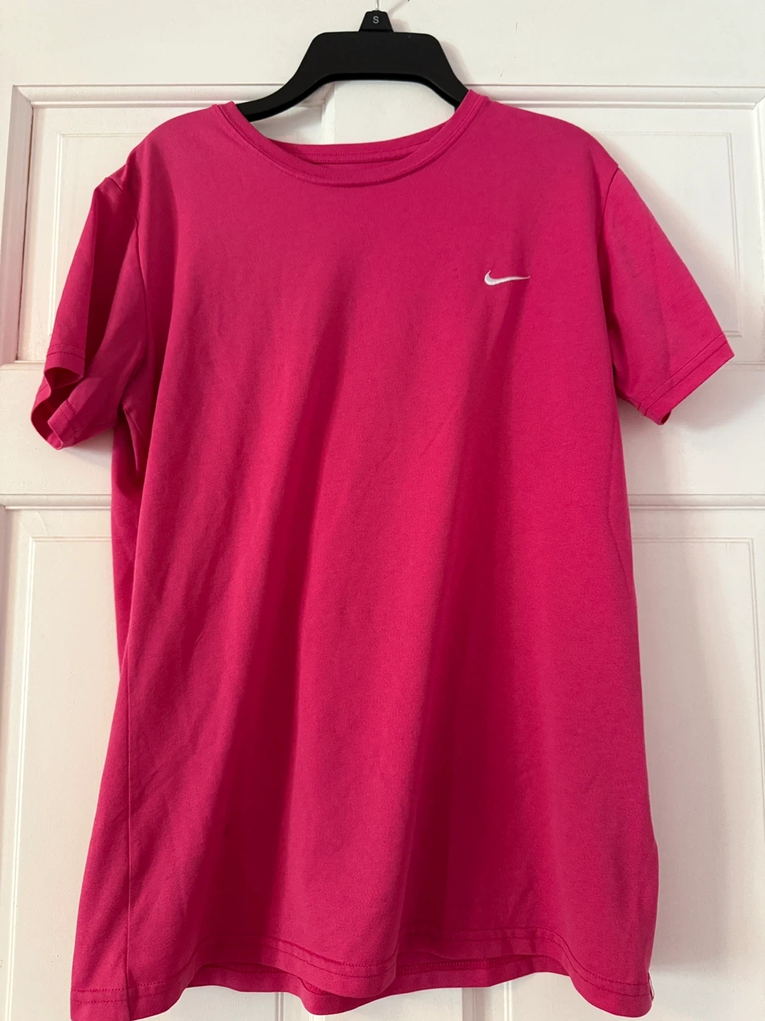 334Selling a Nike Fit Dry T-shirt in pink! It's a size M (8-10) and made in Mexico. Great for workouts or casual wear!