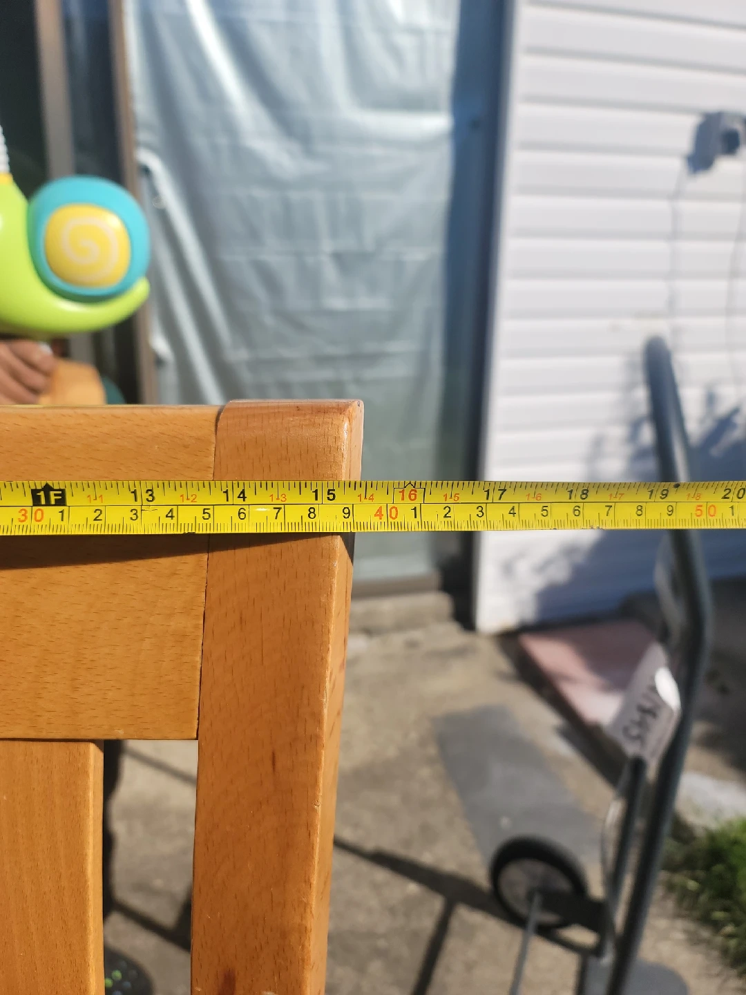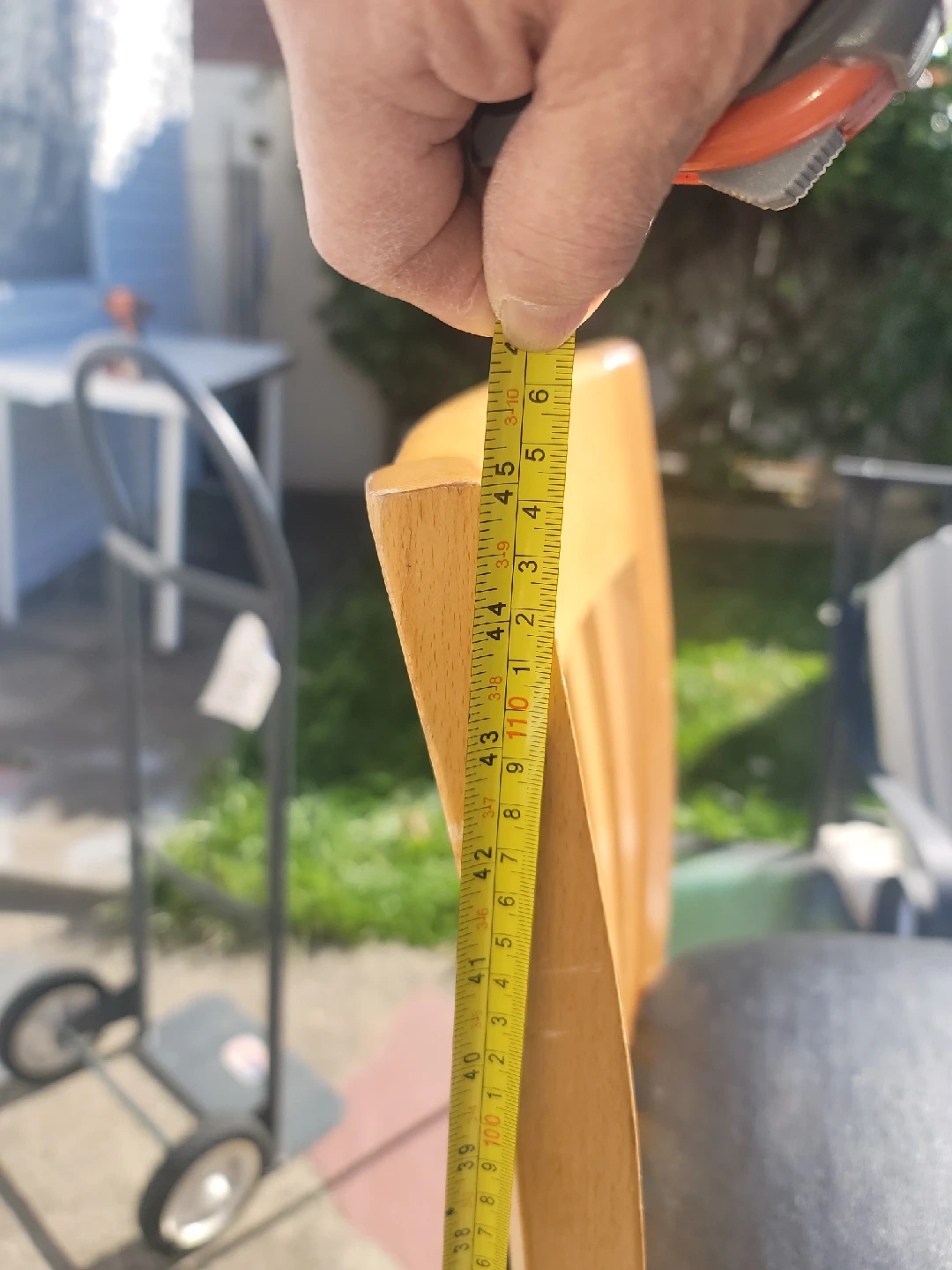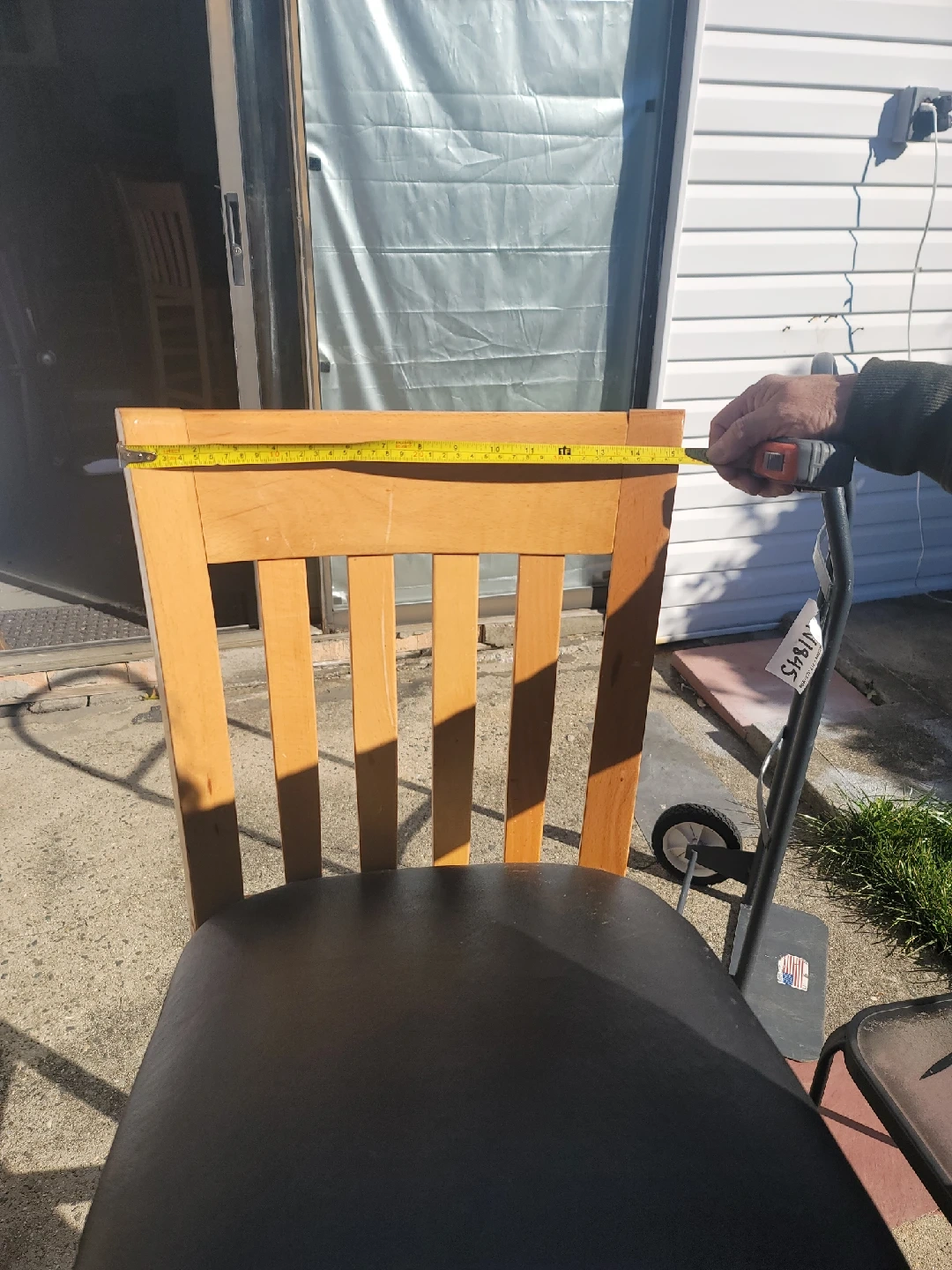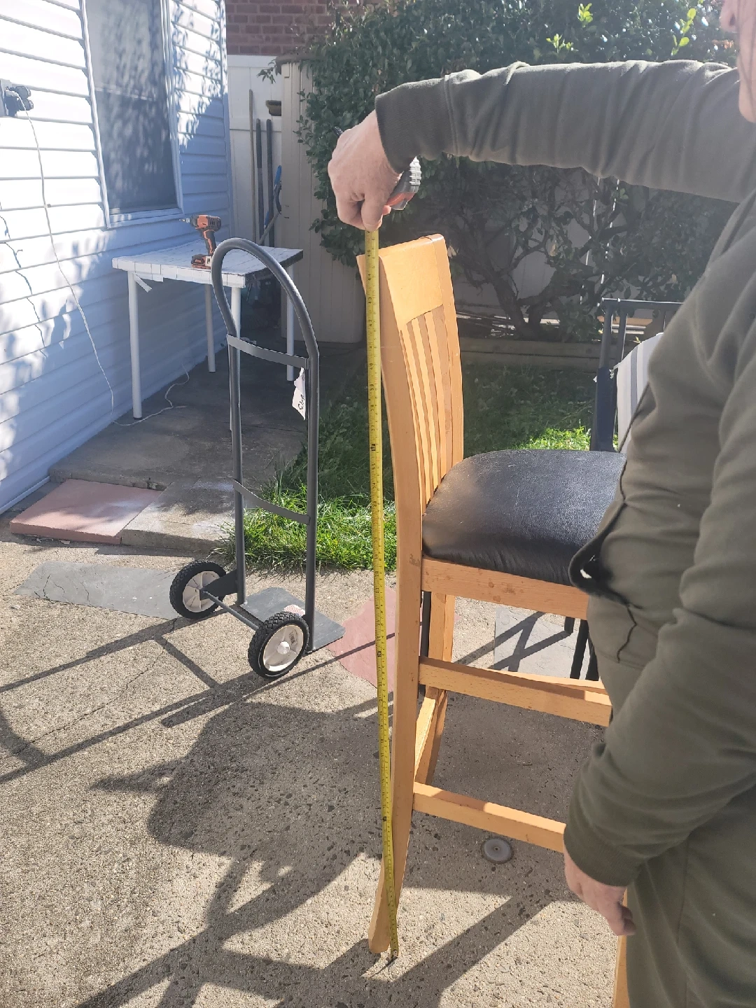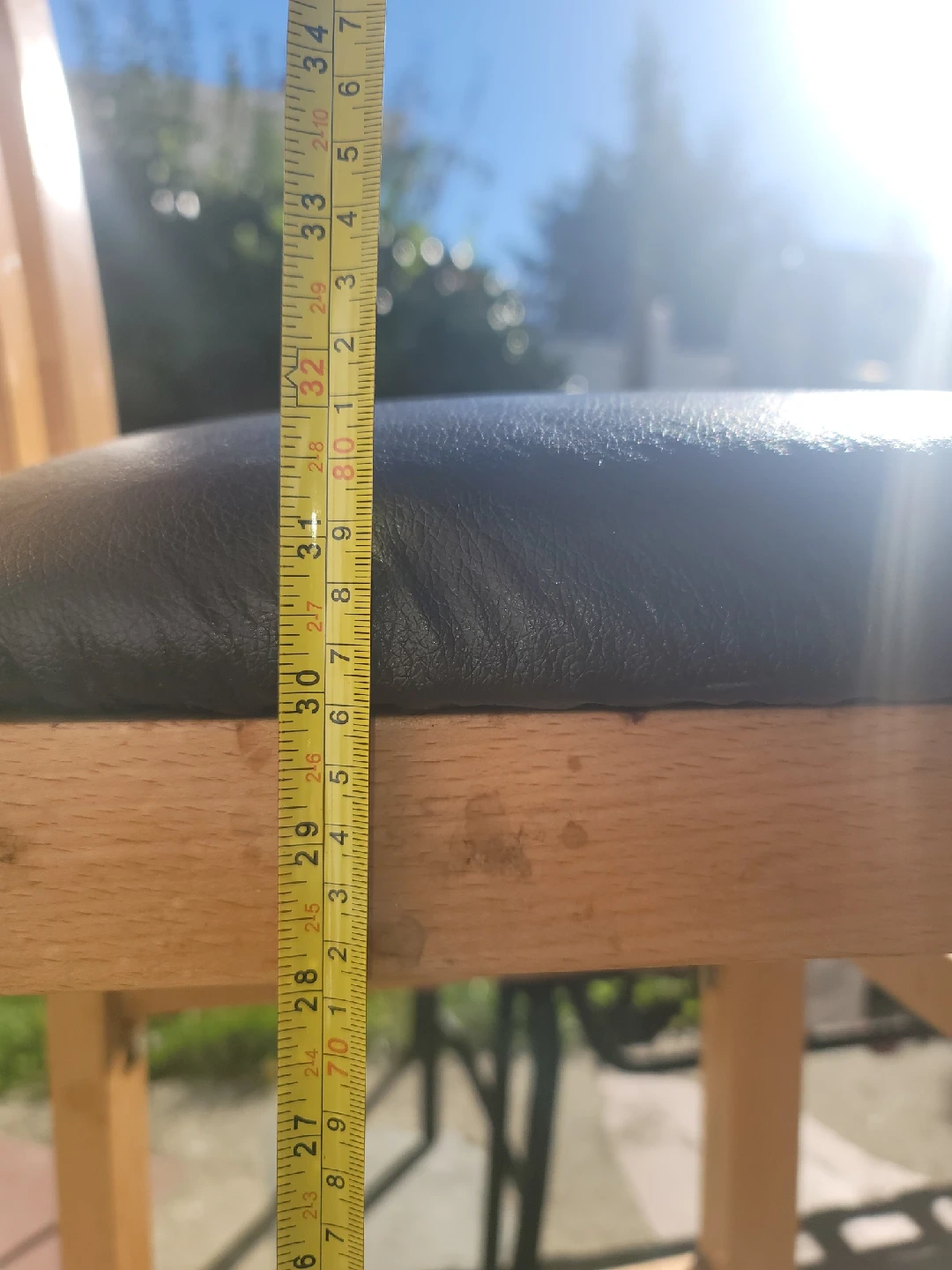 Here's a wooden bar stool with a black leather like seat. It stands approximately 44 inches tall. The seat is around 32 inches from the ground. It's a sturdy and stylish addition to any kitchen or bar area! they are a set of 4.