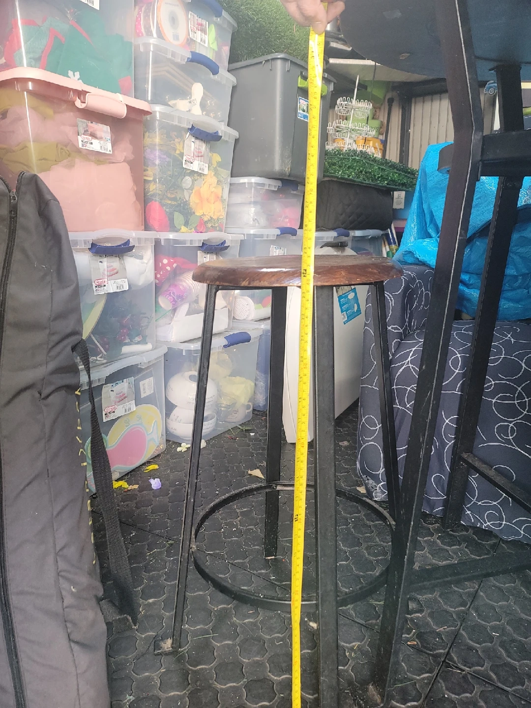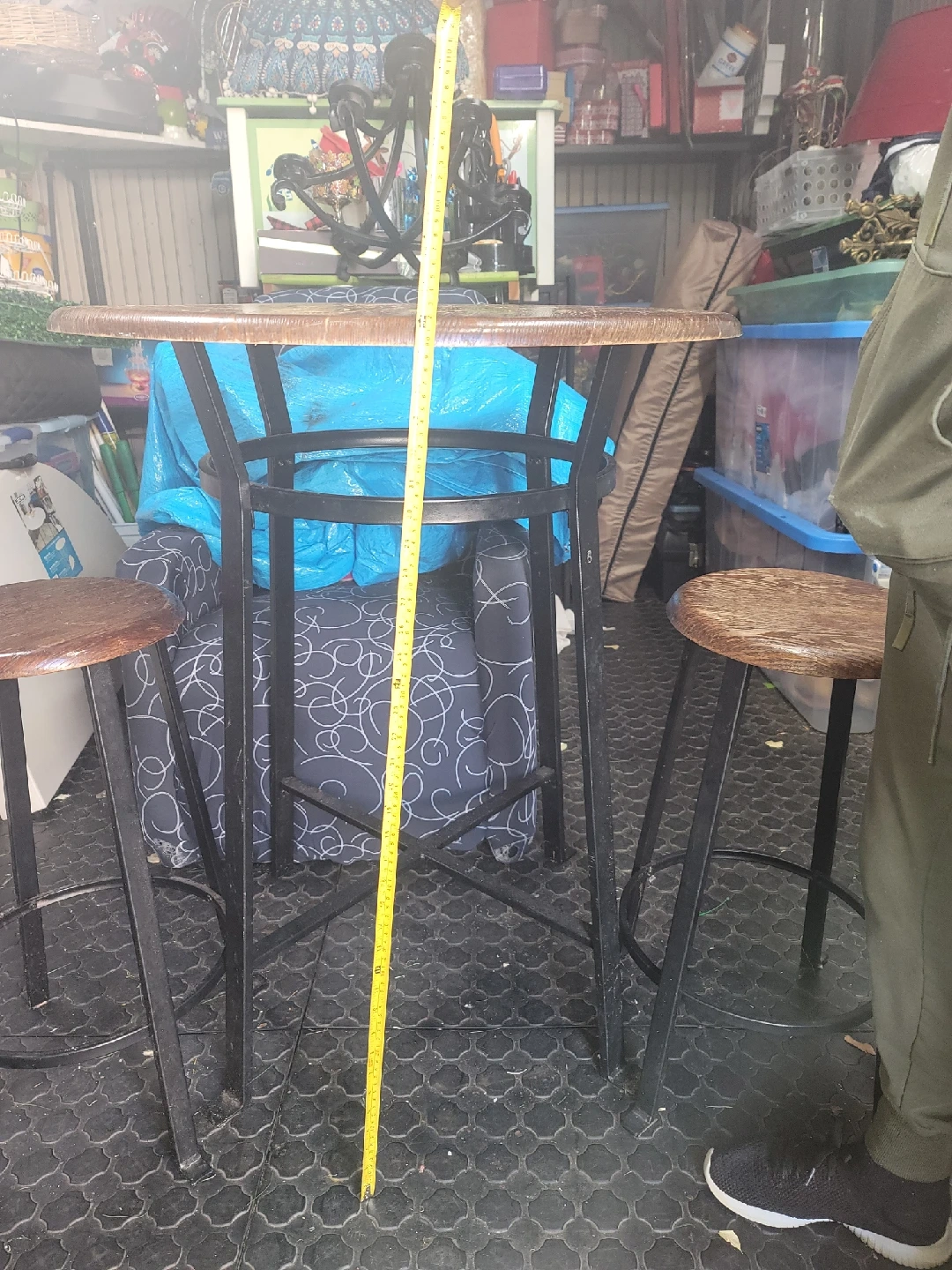 Selling a round wooden pub table with two matching stools. The table has a wooden top and a black metal frame. It's perfect for a small space or a cozy corner. The table's diameter is approximately 36 inches and the height is approximately 42 inches. The stools are also made of wood and metal. They complement the table nicely!