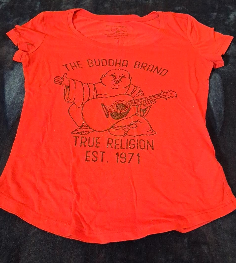 65Selling a True Religion T-shirt featuring the Buddha Brand design. It's a vibrant red color and has the True Religion EST. 1971 logo. Great for casual wear!