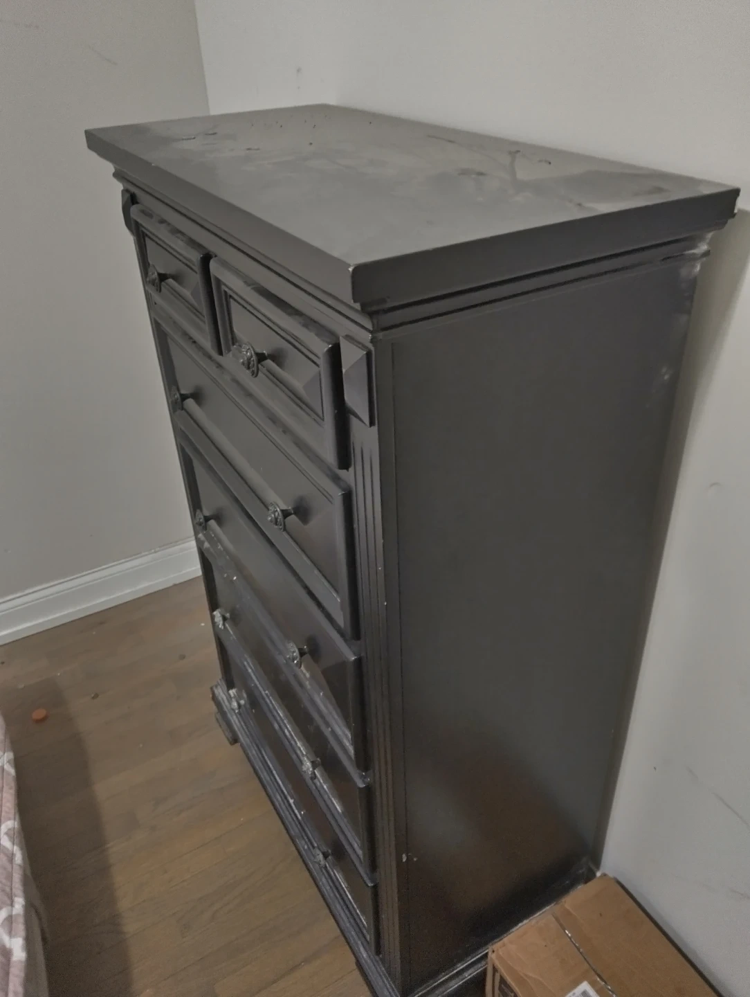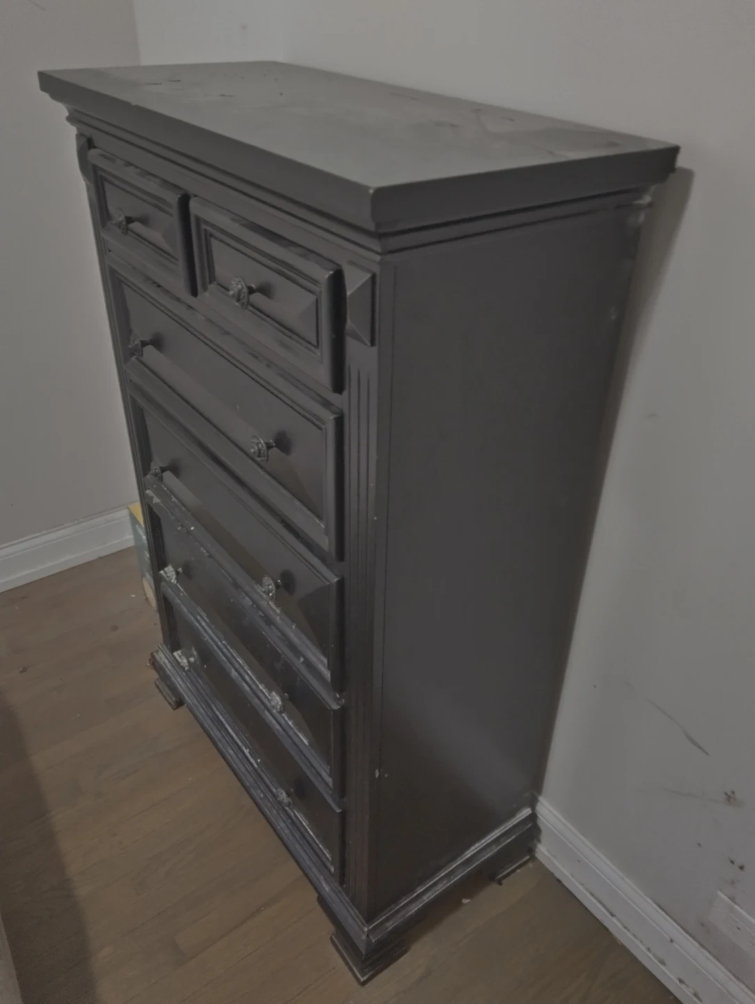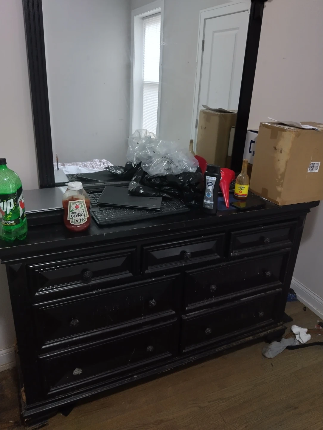 Selling a bedroom set including a dresser, mirror, and nightstand. All pieces are in used condition, with some signs of wear. Great for someone looking for a matching set!