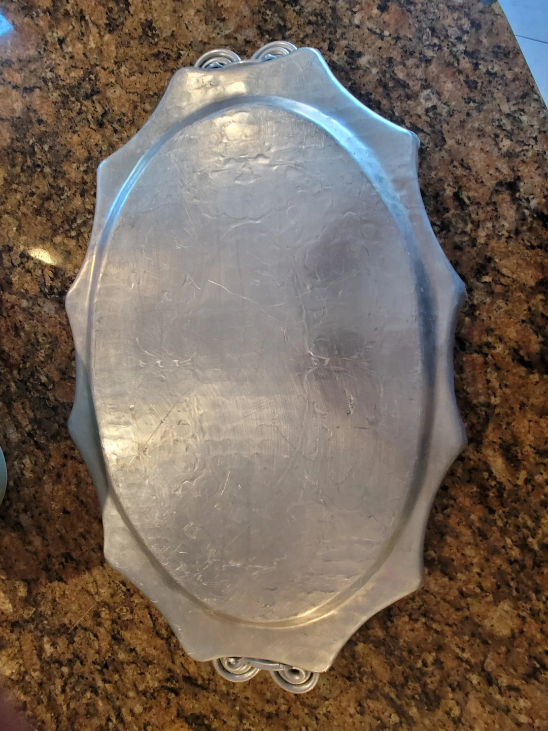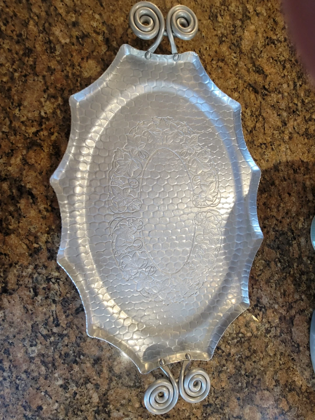 18Selling a World Hand Forged aluminum serving tray. It has a unique design with decorative handles. Perfect for serving snacks or displaying items! pick up in Merrick Ny CASH ONLY