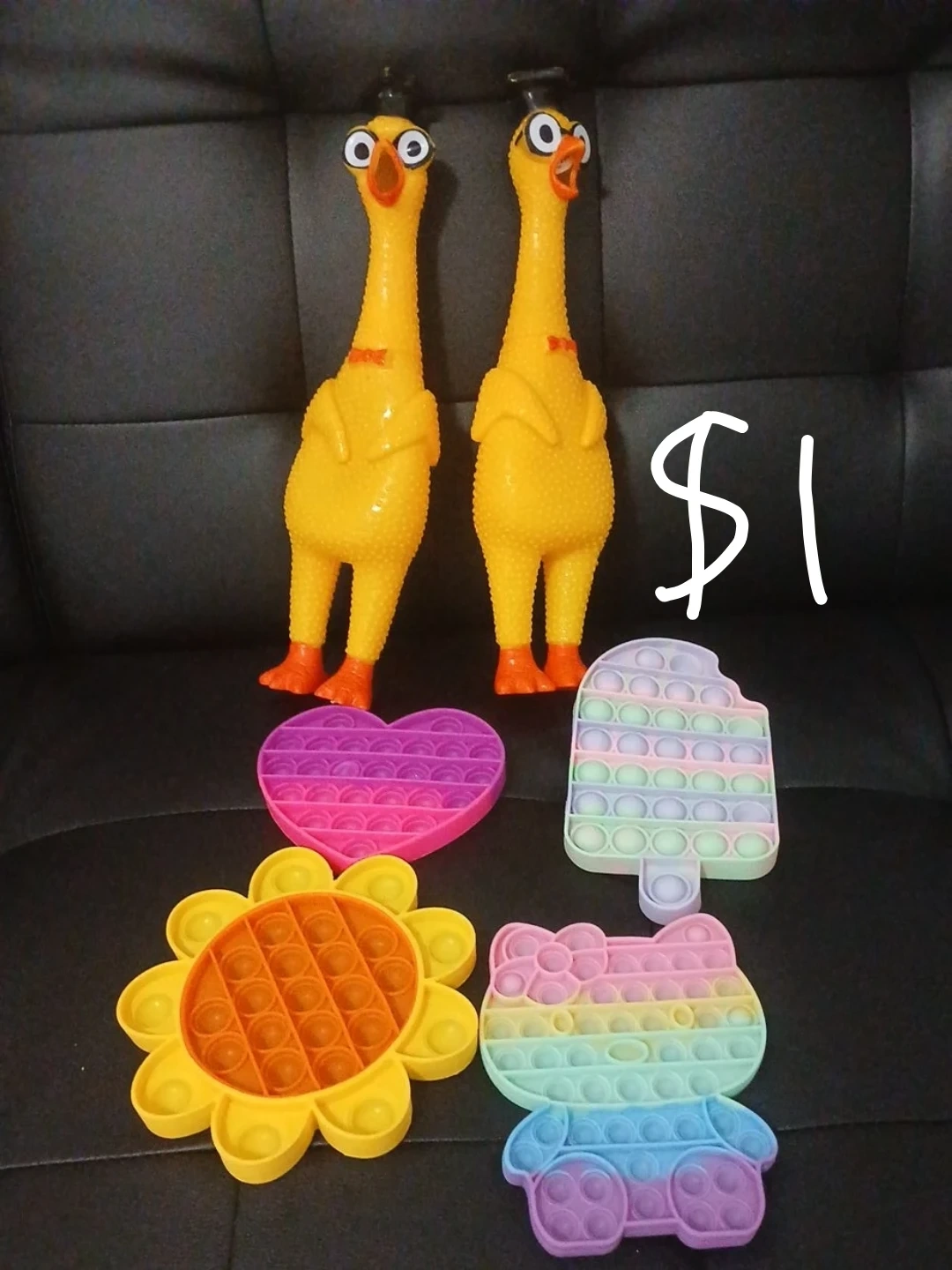 10Selling a fun bundle of toys! Includes two yellow squeaky chickens and four different shaped pop its: a heart, popsicle, sunflower, and Hello Kitty
