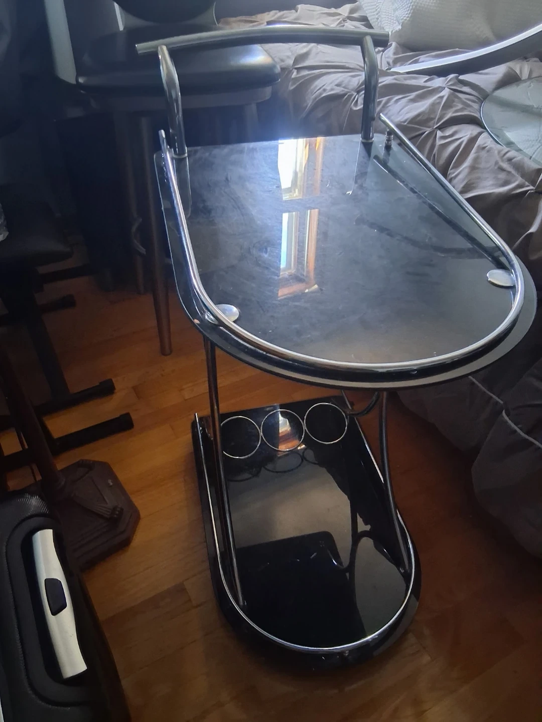 This is a stylish black bar cart featuring a glass top. It's perfect for serving drinks or displaying decorative items. It has a sleek design with a chrome frame and a lower shelf for additional storage. Great for adding a touch of elegance to your home!