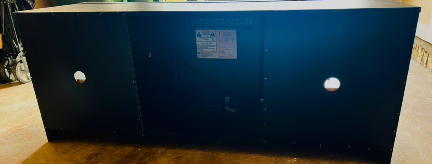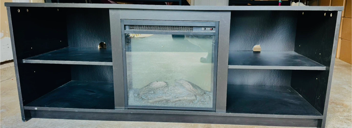 Selling a black fireplace TV stand. It has shelves on the sides and a fireplace in the middle. Great for cozying up your living room!