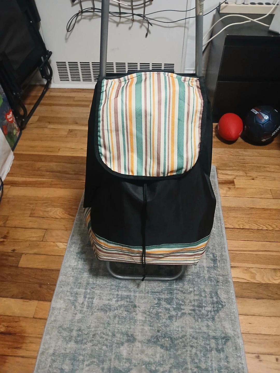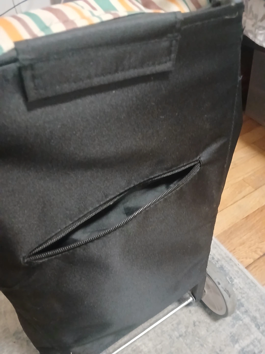 I'm selling a rolling shopping cart! It's black with a striped pattern on the top and bottom. It has wheels for easy transport and a zippered pocket for smaller items. Great for groceries or laundry!