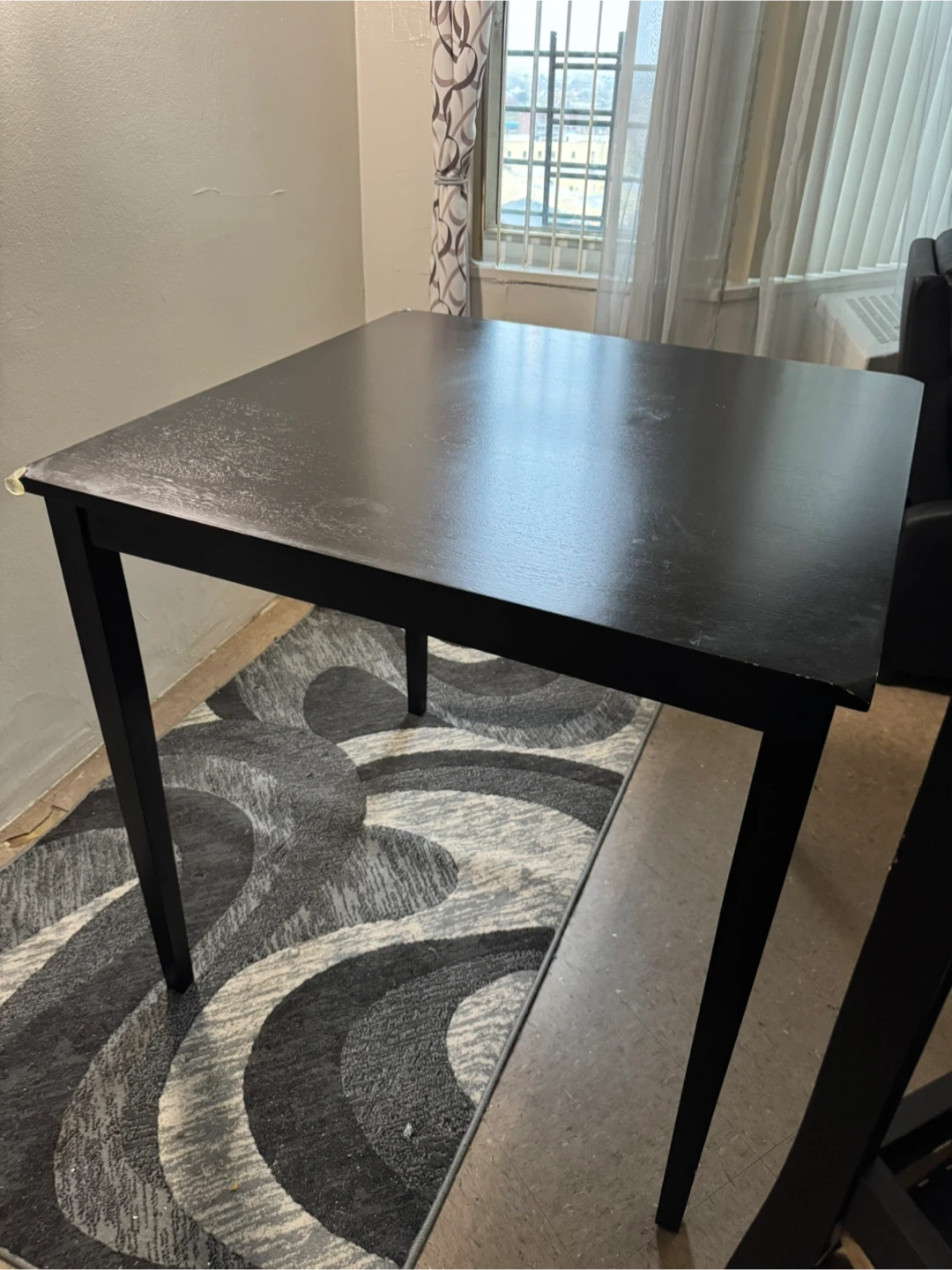 10Selling a black dining table with four chairs. It's a great set for a small dining area or kitchen. The table has a square top and the chairs are a matching style. Perfect for everyday meals or entertaining guests!