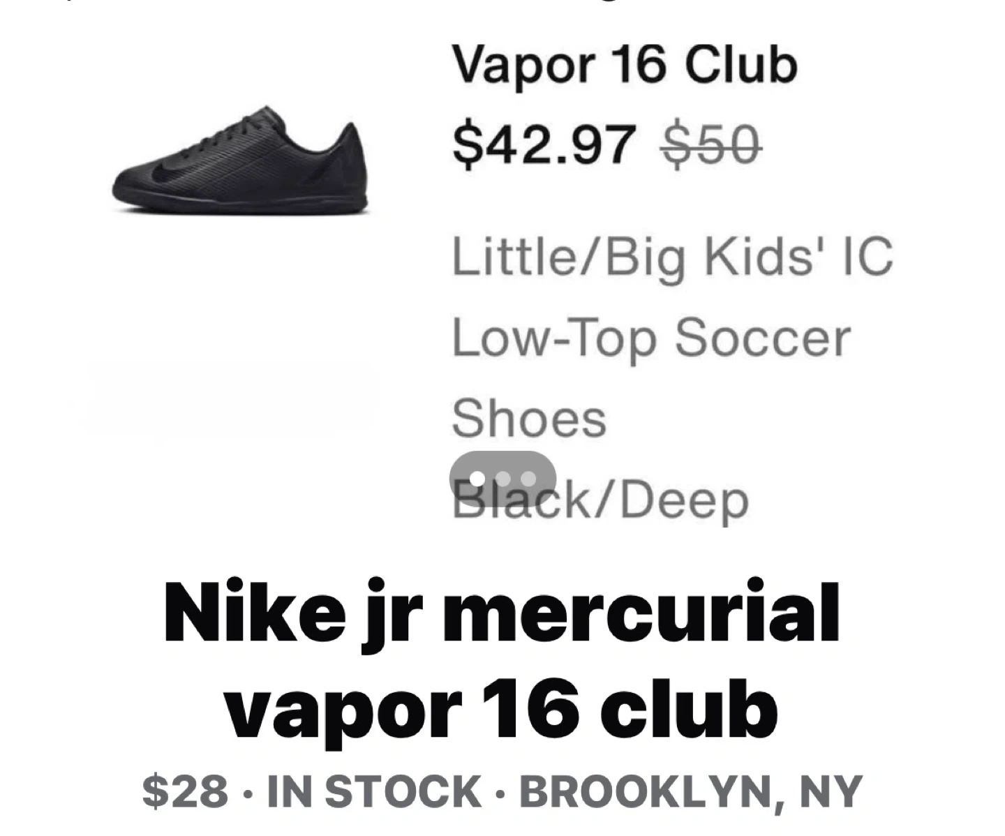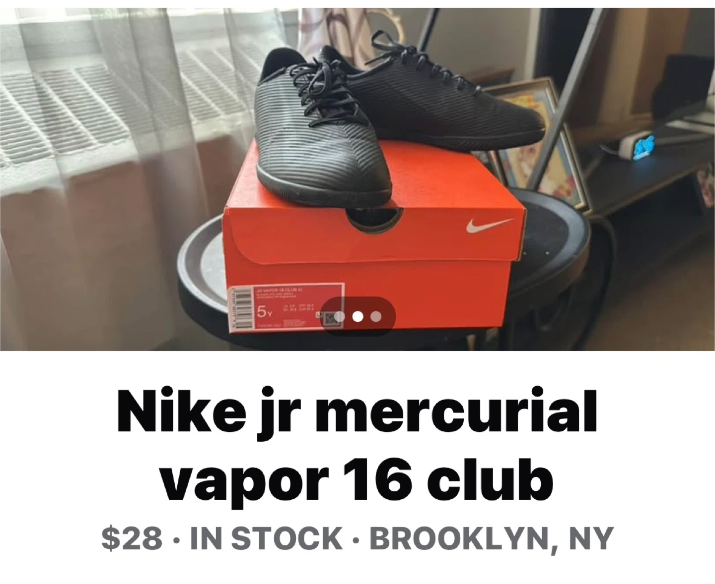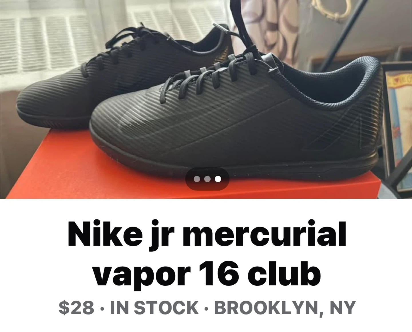 10Selling a pair of Nike Jr Mercurial Vapor 16 Club soccer shoes in black! They are in great condition and come with the original box. Perfect for little/big kids' indoor soccer. Size is 5Y.