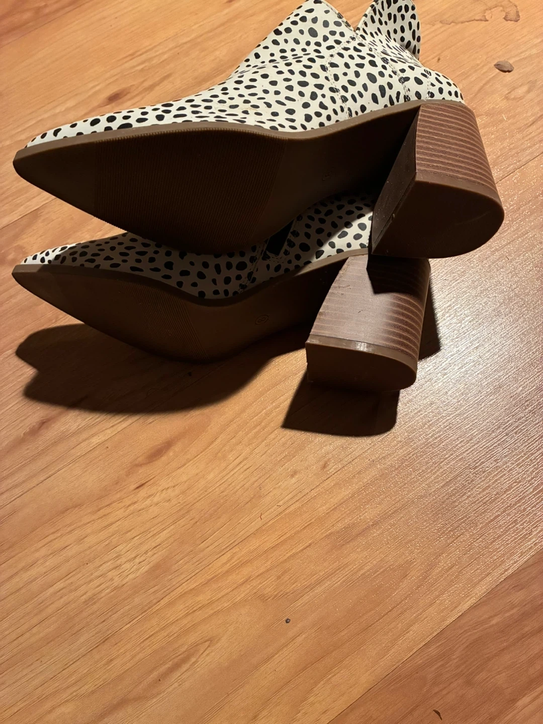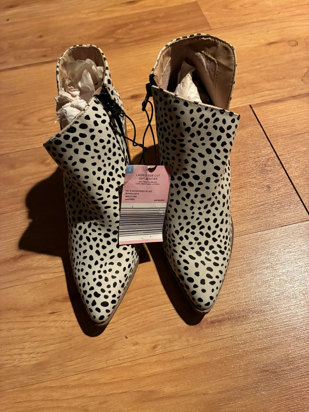 10Selling a pair of Serra ladies side-cut ankle boots in a stylish Dalmatian print! They are a size 8 and have a trendy side-cut design. Perfect for adding a fun touch to any outfit!