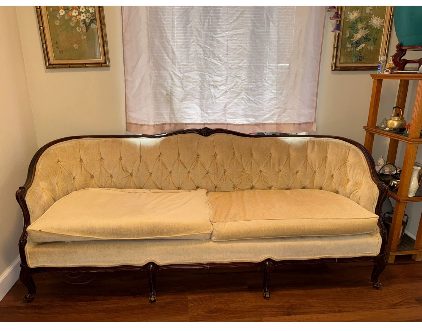 Selling a lovely vintage sofa with tufted detailing. It's a cream color and would look great in any living room or sitting area. It has a classic design with dark wood trim and legs. The sofa has some wear, as shown in the pictures, but it's still comfortable and stylish!