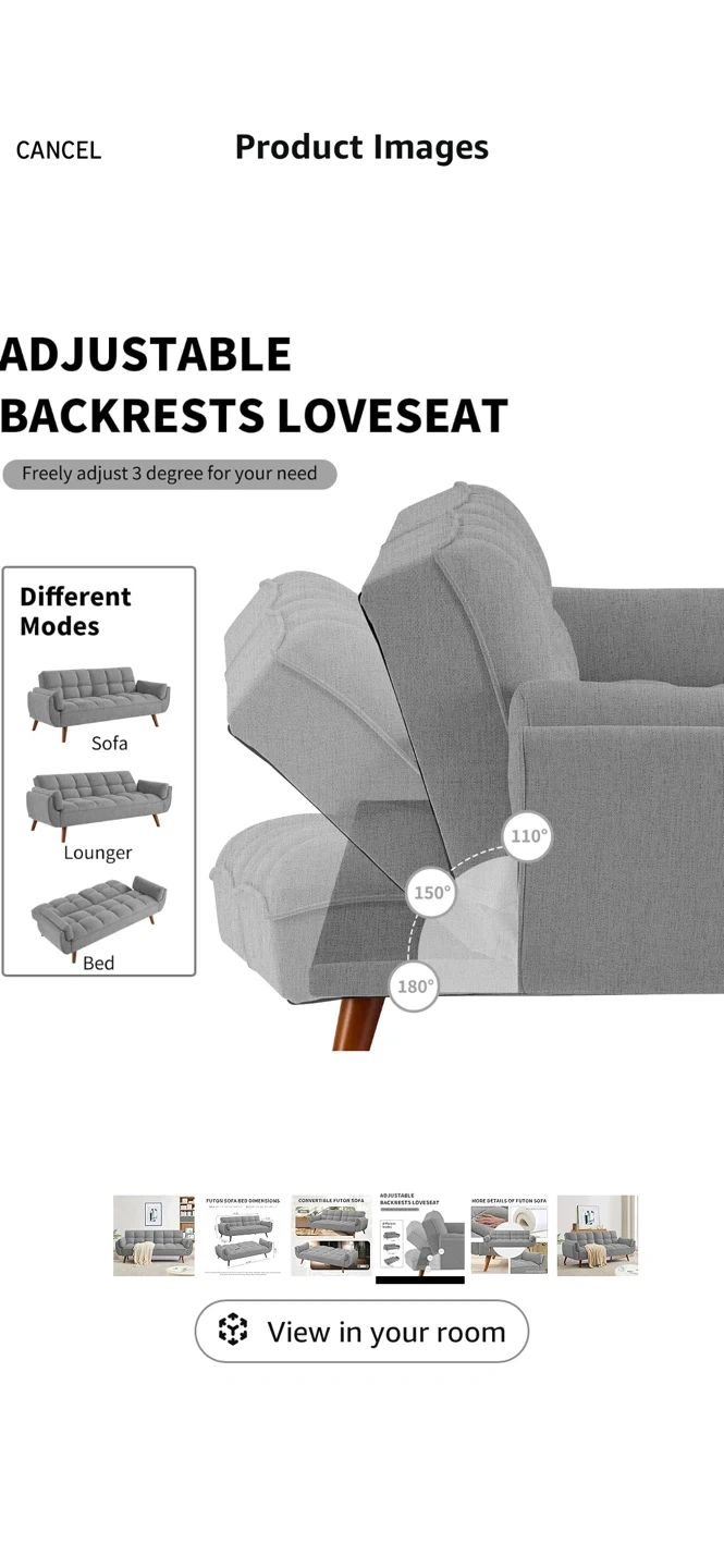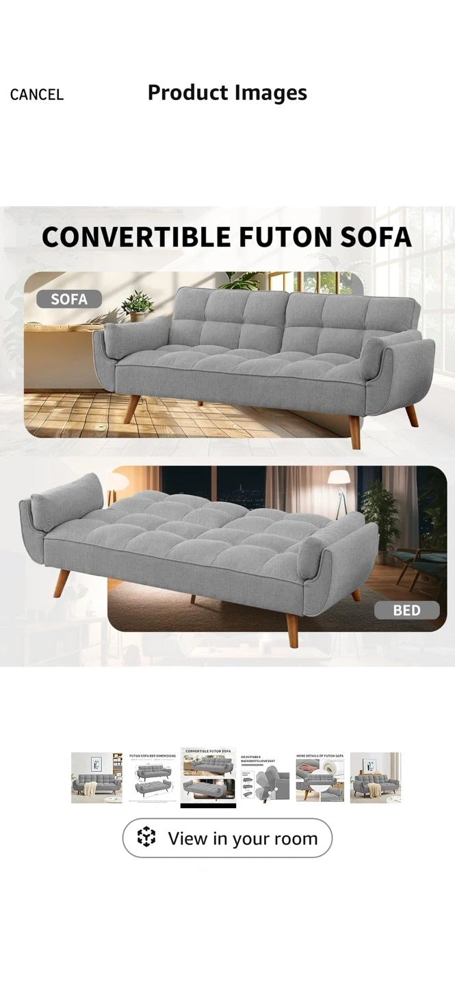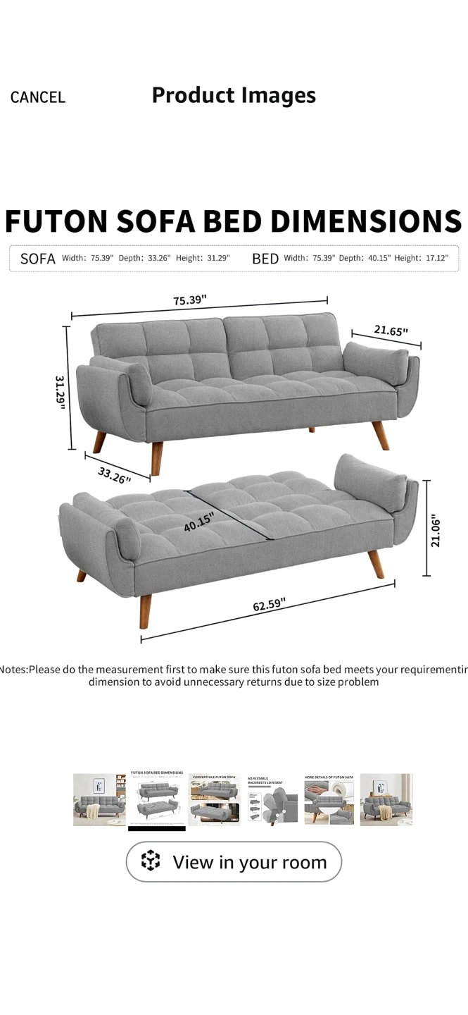 28This is a convertible futon sofa bed, perfect as a linen sleeper couch! It's a modern 3-seater tufted sofa with adjustable backrests and solid wood legs. Great for a living room, bedroom, or small space. The color is gray. The dimensions are: Sofa Width: 75.39", Depth: 33.26", Height: 31.29" and Bed Width: 75.39", Depth: 40.15", Height: 17.12"๐ฅ