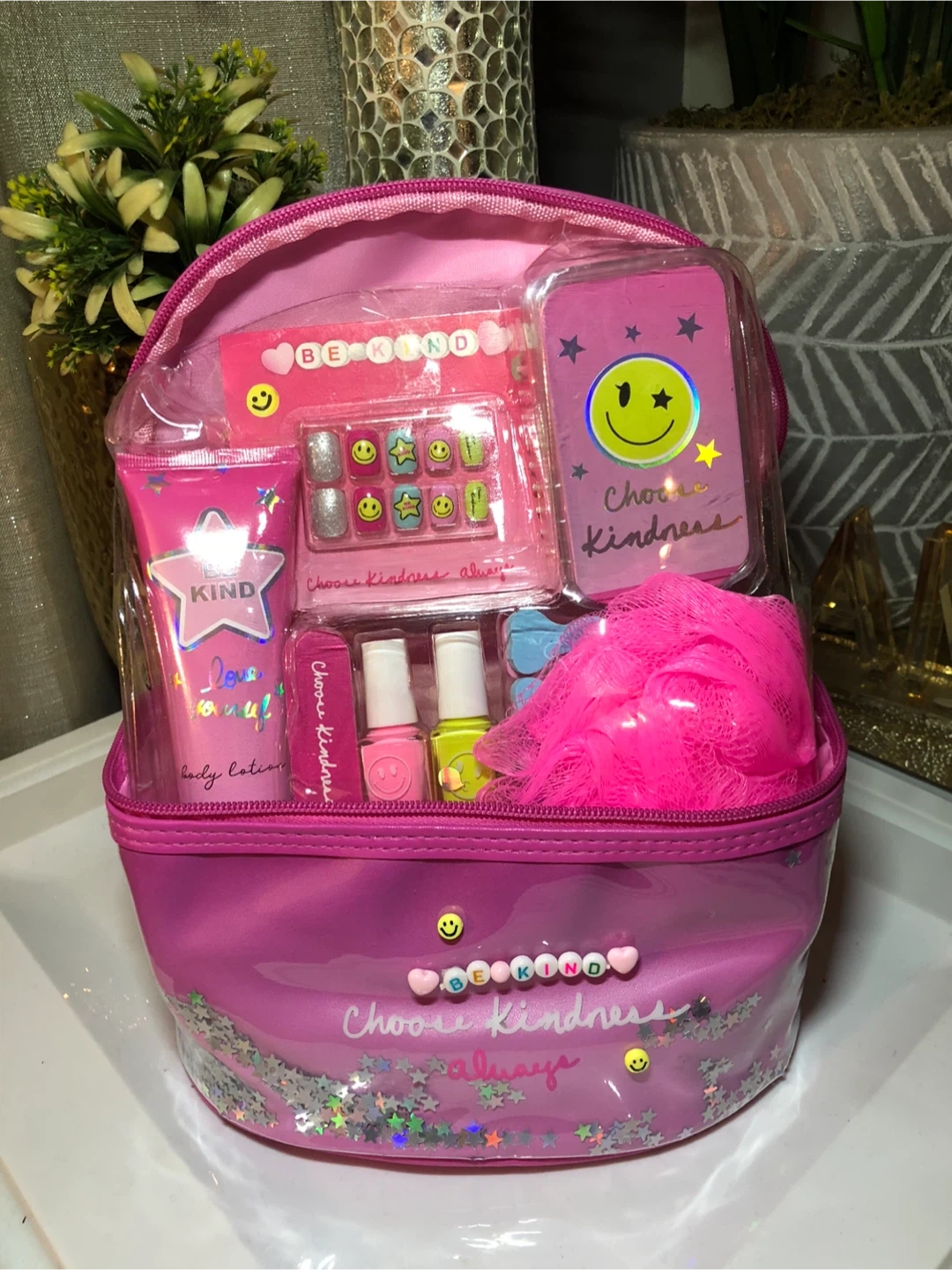 This is a super cute Rainbow Sugar beauty set! It comes in a fun pink color and includes: