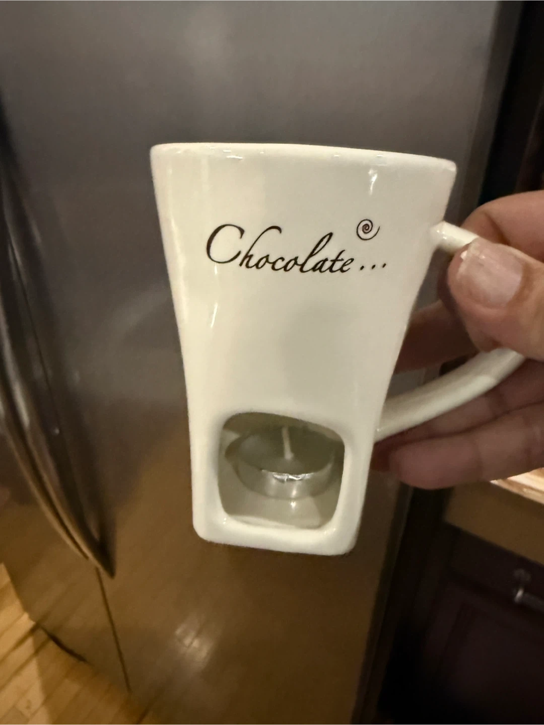 I'm selling a unique chocolate mug! It's white with "Chocolate..." written on the side and has a built-in candle holder at the bottom for keeping your drink warm. It's in great condition and ready for a new home