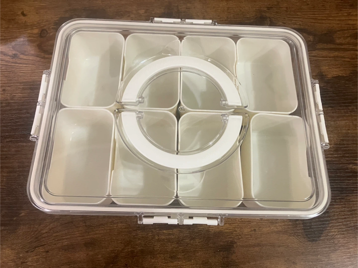 I'm selling a clear plastic food storage container! It comes with 8 individual compartments, perfect for keeping your snacks and ingredients organized. The container has a clear lid, making it easy to see what's inside. It is in great condition and ready for a new home!