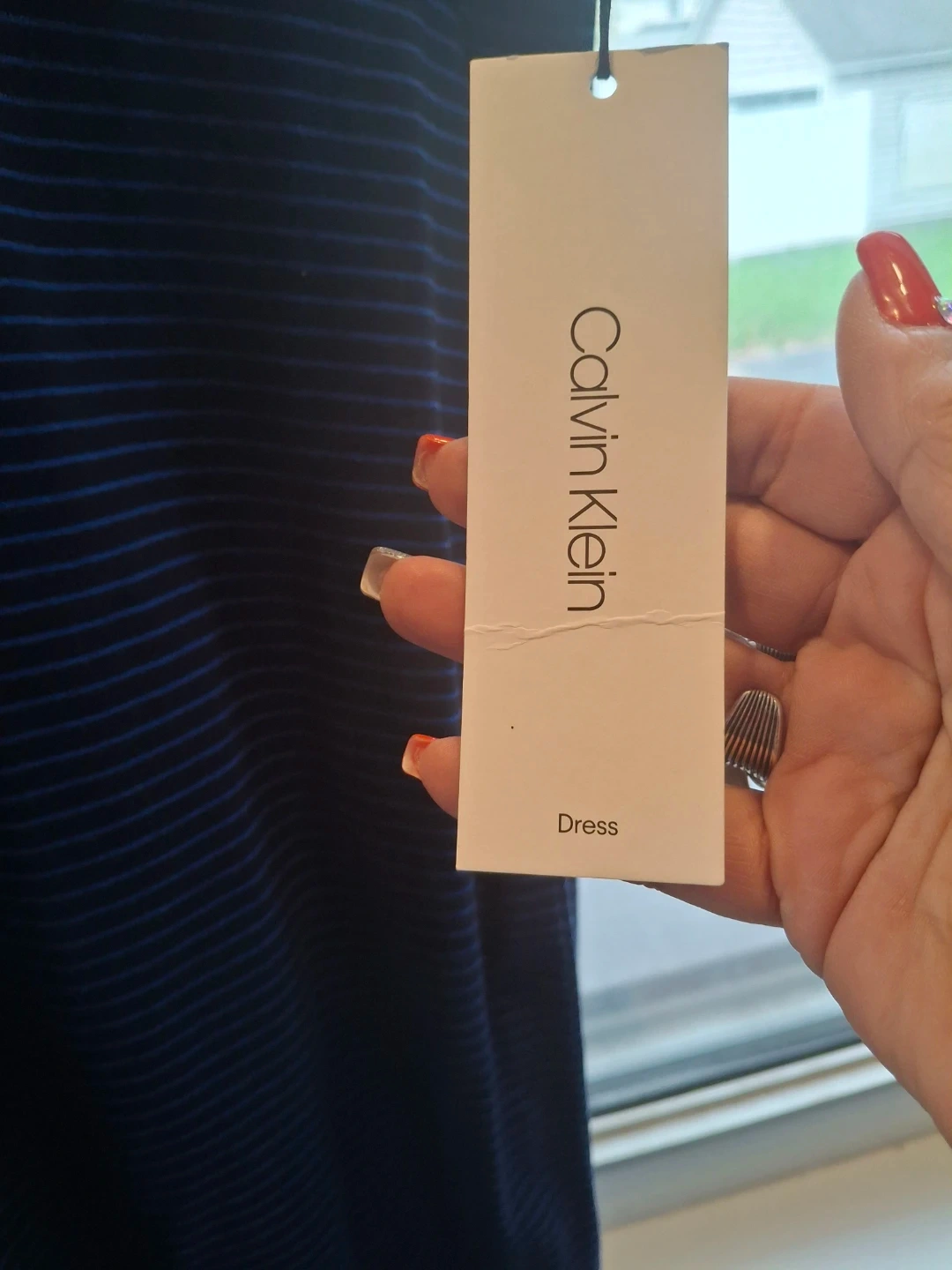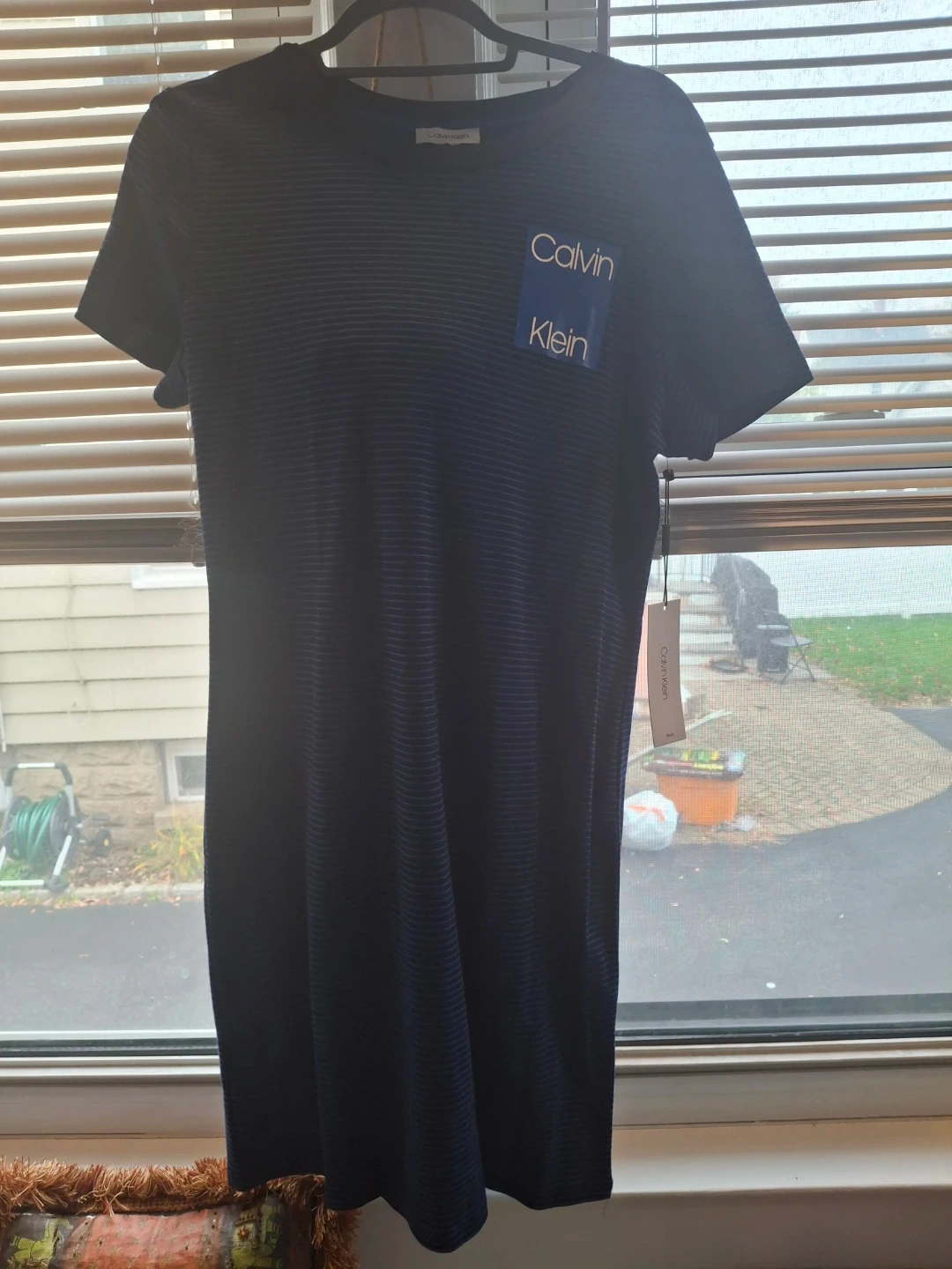 60Selling a Calvin Klein dress! It's a stylish dress with a striped pattern. Perfect for casual wear or dressing up for an event