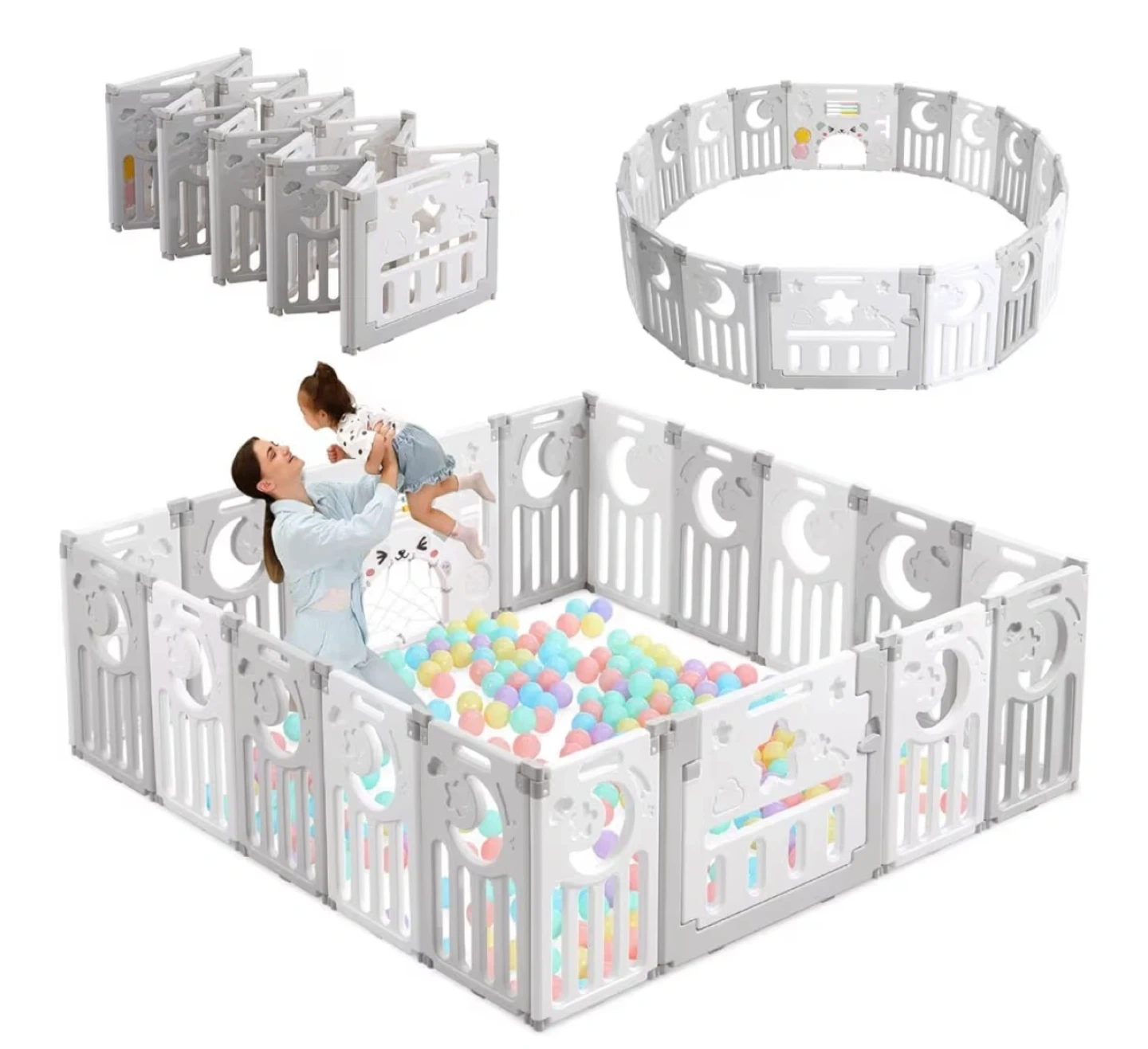 Selling a baby playpen in great condition! This playpen is perfect for keeping your little one safe and entertained. It features a cute design with moons and stars. It can be configured in different shapes to fit your space. Perfect for babies and toddlers!